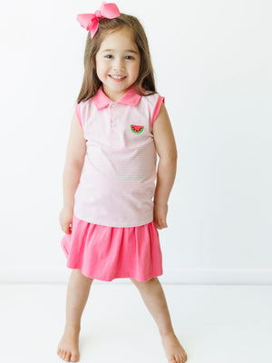 Get ready for a scoop of fun with the Ice Cream Truck Skort Set! This set features a playful embroidered ice cream truck and a light pink striped top with a pop of purple ruffles. The purple skort adds a touch of style to this adorable girls' outfit. Cool, comfy, and cute!
