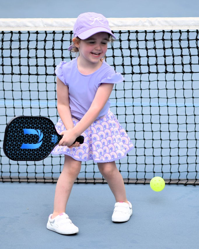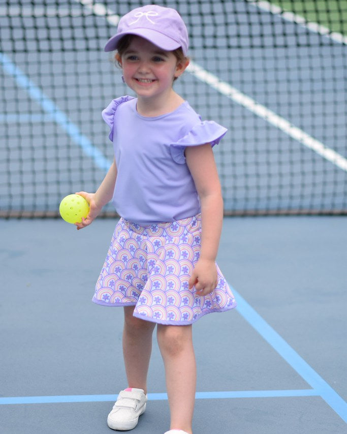 Unleash your girl's style with the Angel Sleeve Top- Lavender! This playful top includes a flutter sleeve. Perfect for the fashionista in your life. Pair with the Retro Rainbow Print Skort or Shorts for the perfect look!