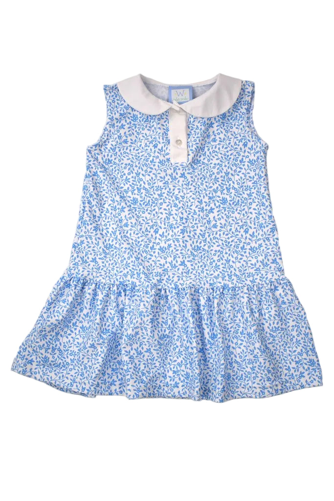 A must have for your girl's wardrobe! The Blue Floral Polo Dress, featuring a blue floral print and a drop waist with peter pan collar. Perfect for all-day comfort and style.