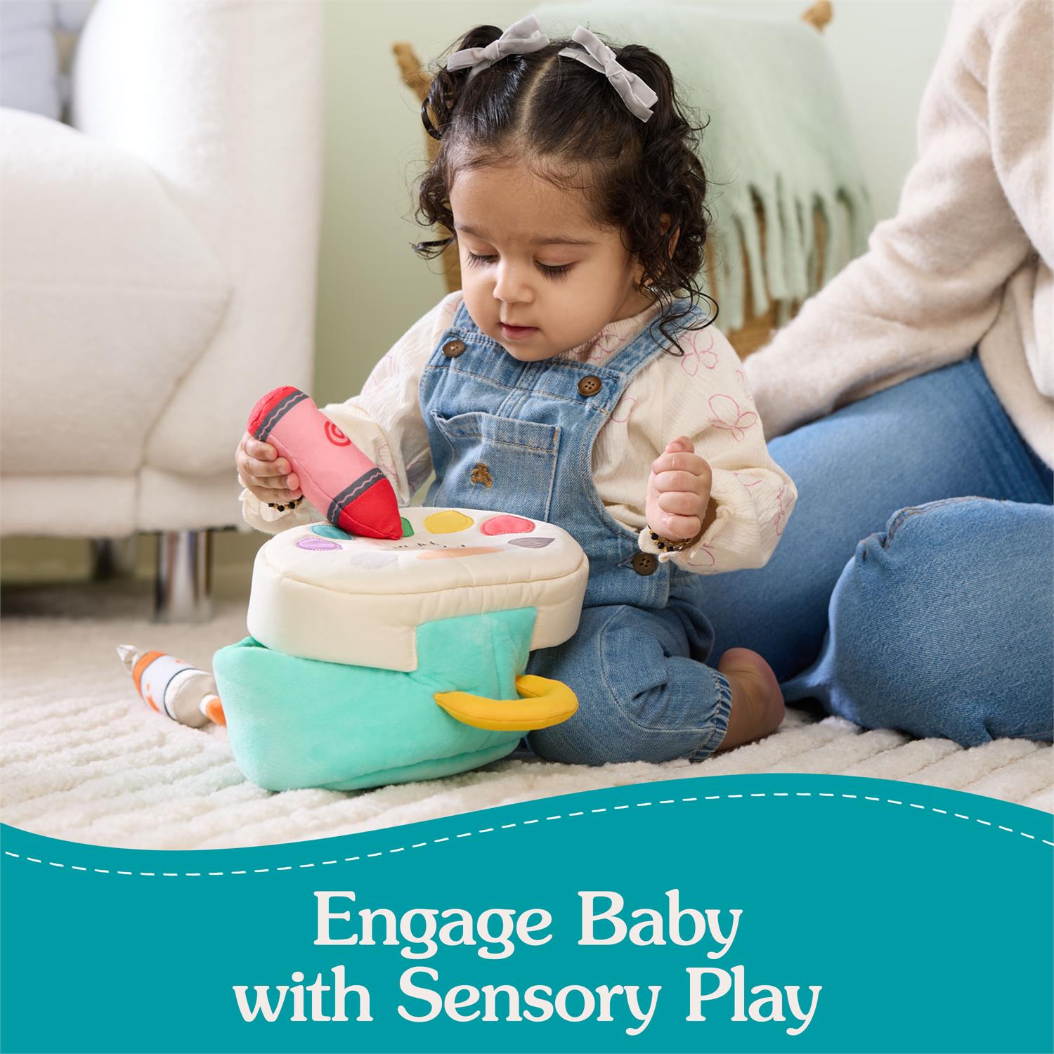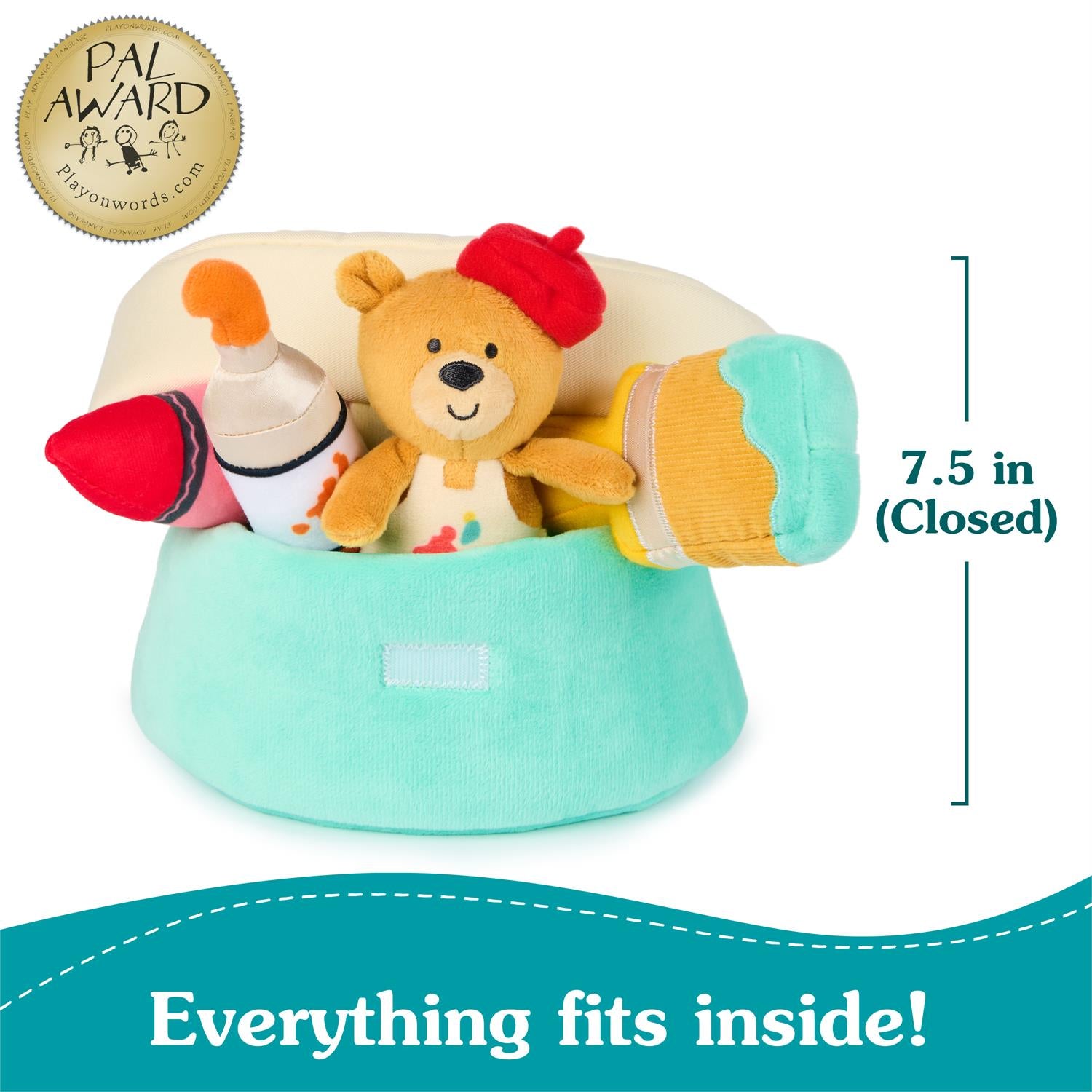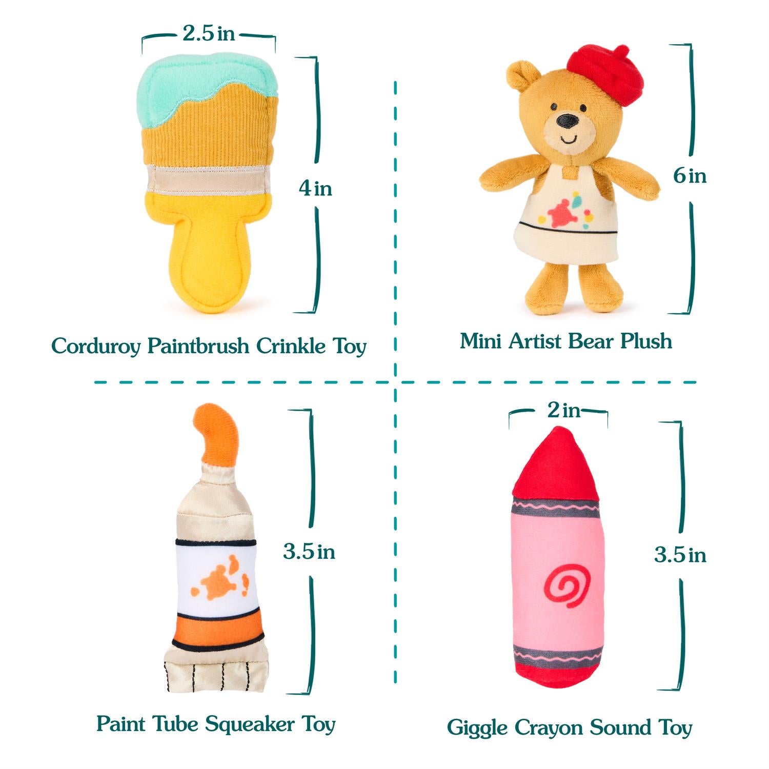The My Little Artist playset is a whimsical, modern way for future artists of every stripe to play and engage in tactile fun with different sounds and textures! This adorable five-piece playset contains four different sensory-stimulating plush toys, all designed with special features for extra artistic fun: the yellow and teal corduroy paintbrush delivers a satisfying crinkle with each squeeze, the red crayon makes squeaky giggle sounds, the acrylic paint tube doubles as a squeaker toy, and the miniature teddy bear plush is dressed as a painter, ready to help baby unleash their inner artist in a cute red beret and paint-splattered apron. The 7.5 in paint palette is adorned with rainbow embroidered paint splotches and opens with a touch-and-close fastener, transforming into a carrying case with a soft handle sized for little hands. This set is a wonderful way to encourage baby to touch, discover, and fall in love with their creative side without any mess even on the go! Just like the rest of the innovative