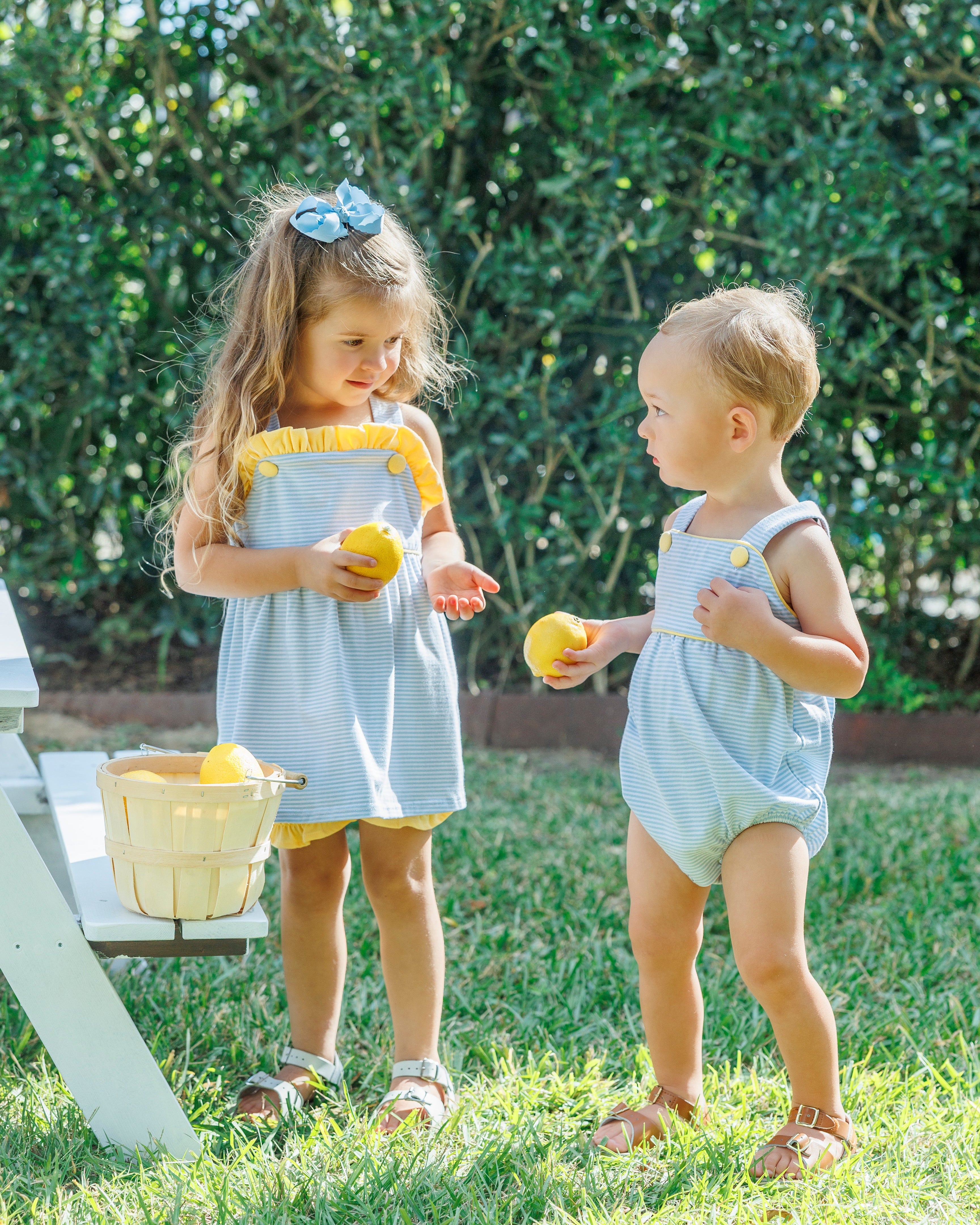 Keep your girl cool, comfy, and ready for summer fun in our classic Lucy Bloomer Set in light blue stripe and yellow.