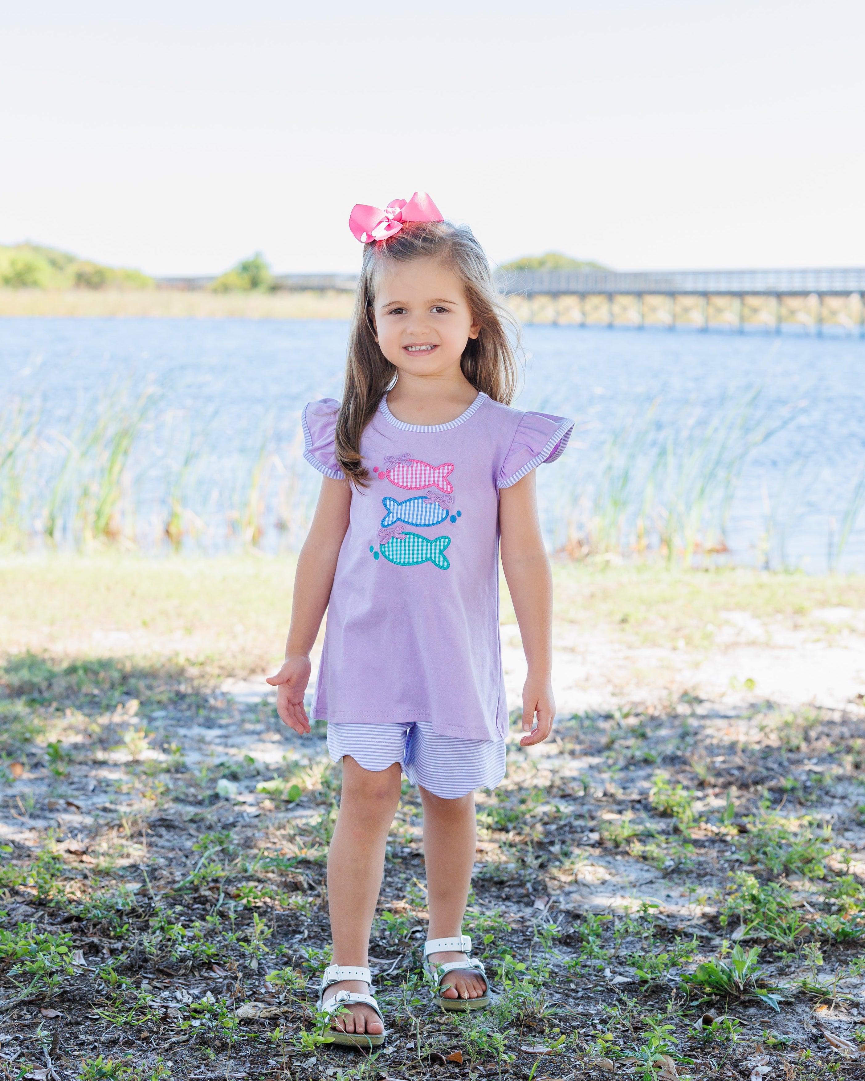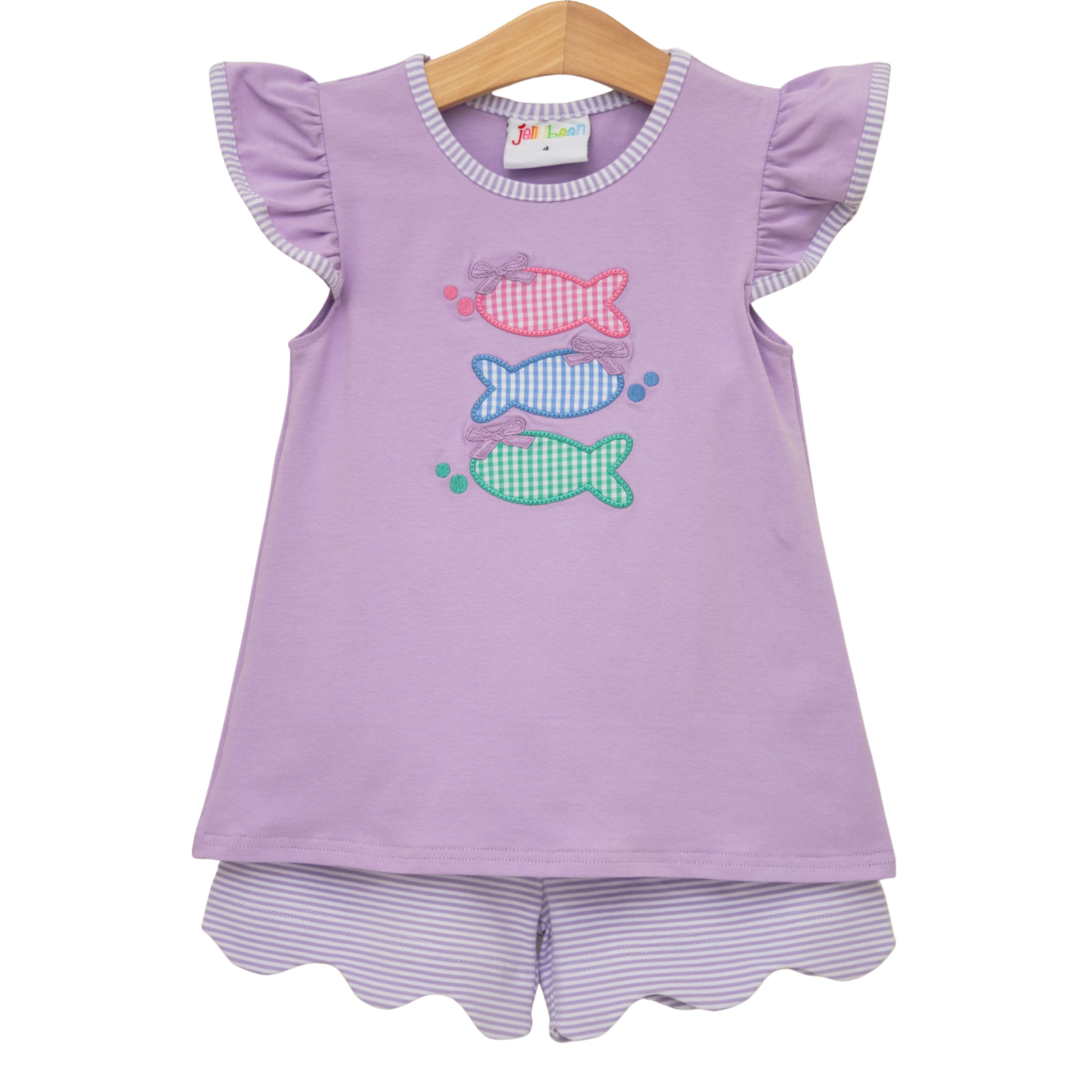 - Lavender short sleeve flutter top with 3 gingham print fish applique
