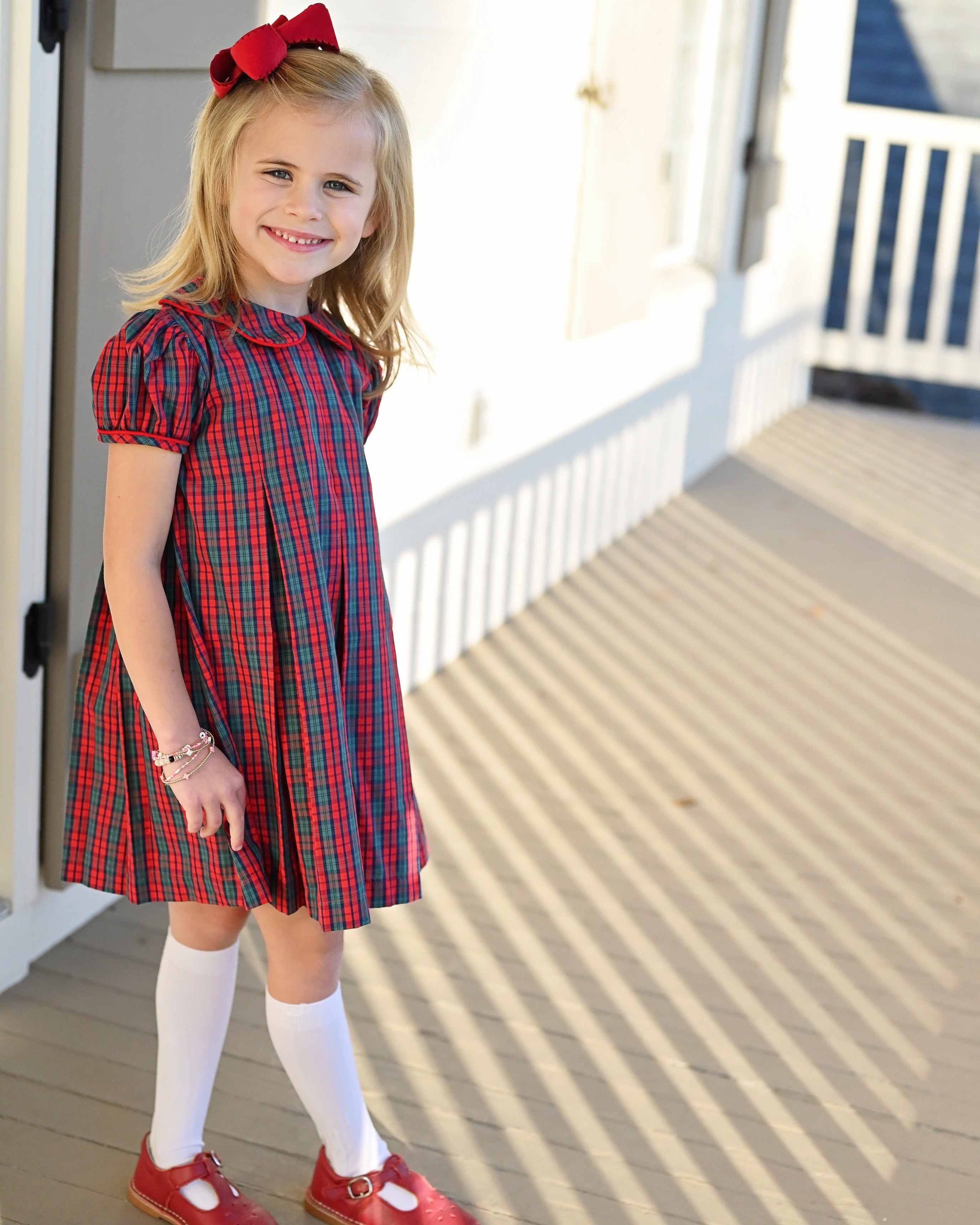 The Paige Dress in Red Christmas Plaid is a pleated style dress and is such a precious and traditional Holiday option for your little girl. Matching Sibling Outfits Available!