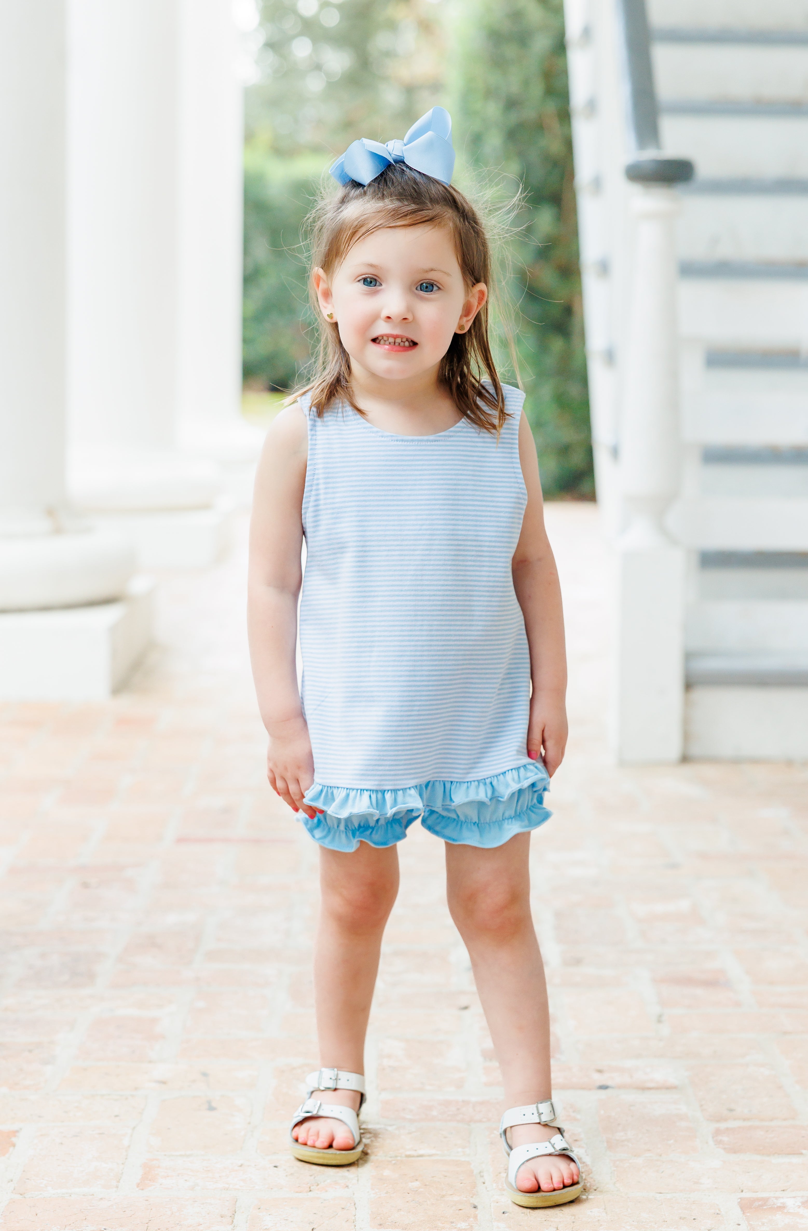 Get ready to swing into summer with our Swing Back Bloomer Set! This light blue striped set features a playful swing back top and comfortable bloomers. Perfect for those sunny days and endless fun. Don't miss out on this must-have set!