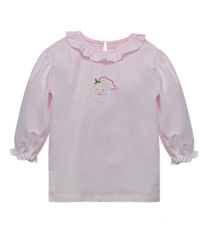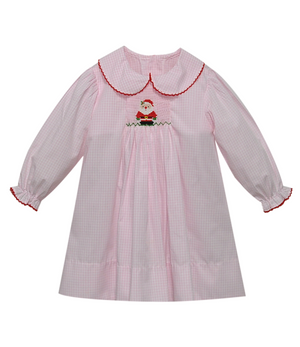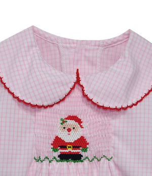 The Shay Bloomer Set in pink is a festive delight for girls, featuring a smocked Santa face that adds a touch of holiday magic. With a sweet Peter Pan collar and vibrant red trim, this playful set is perfect for spreading Christmas cheer in style.