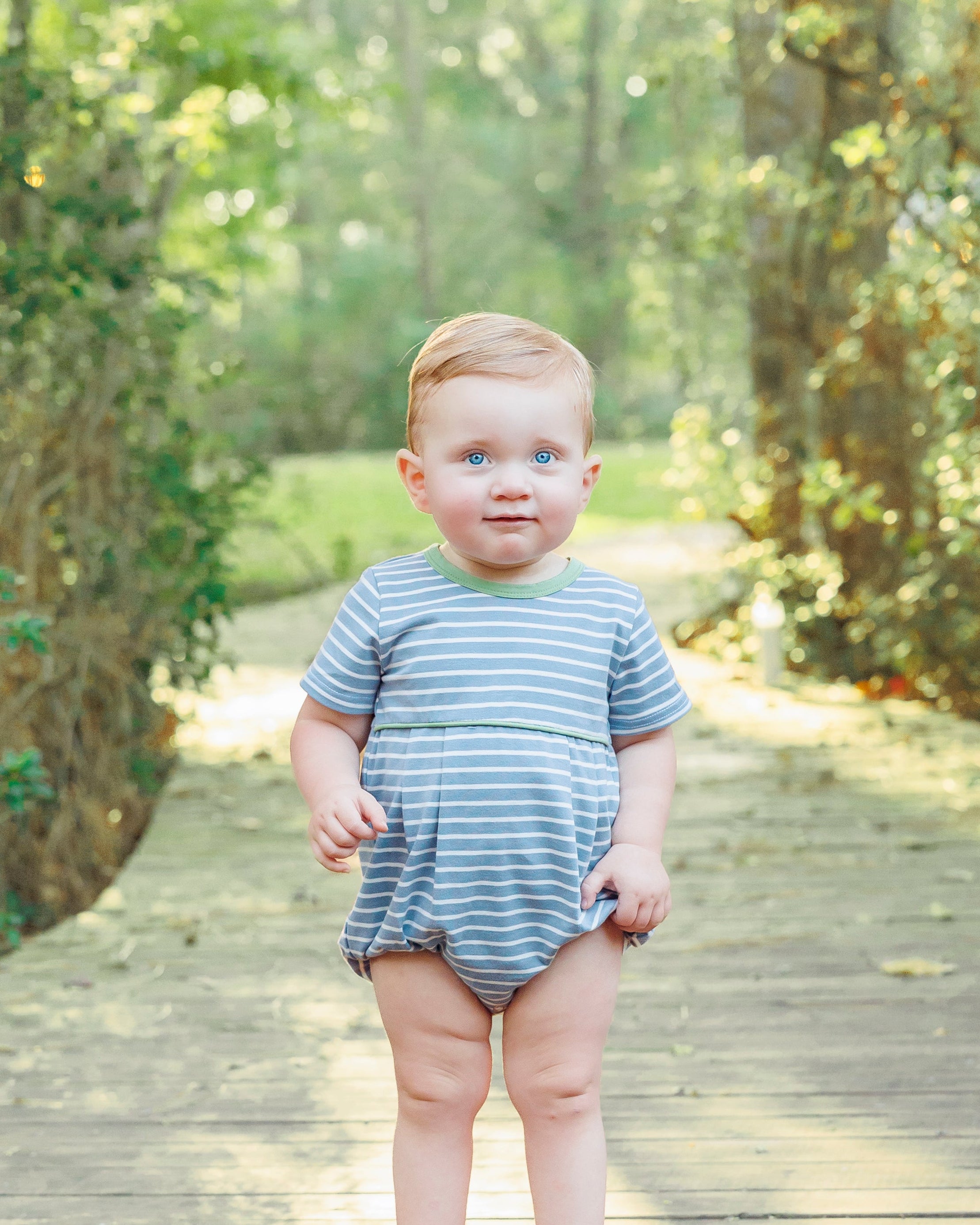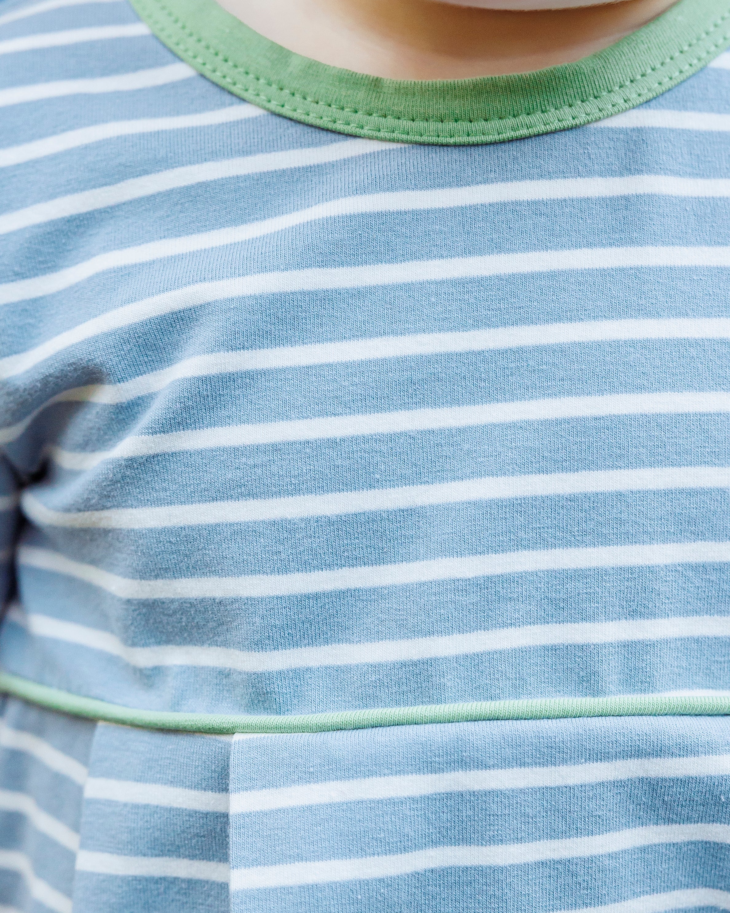 • Slate blue and white stripe short sleeve bubble with sage green trim