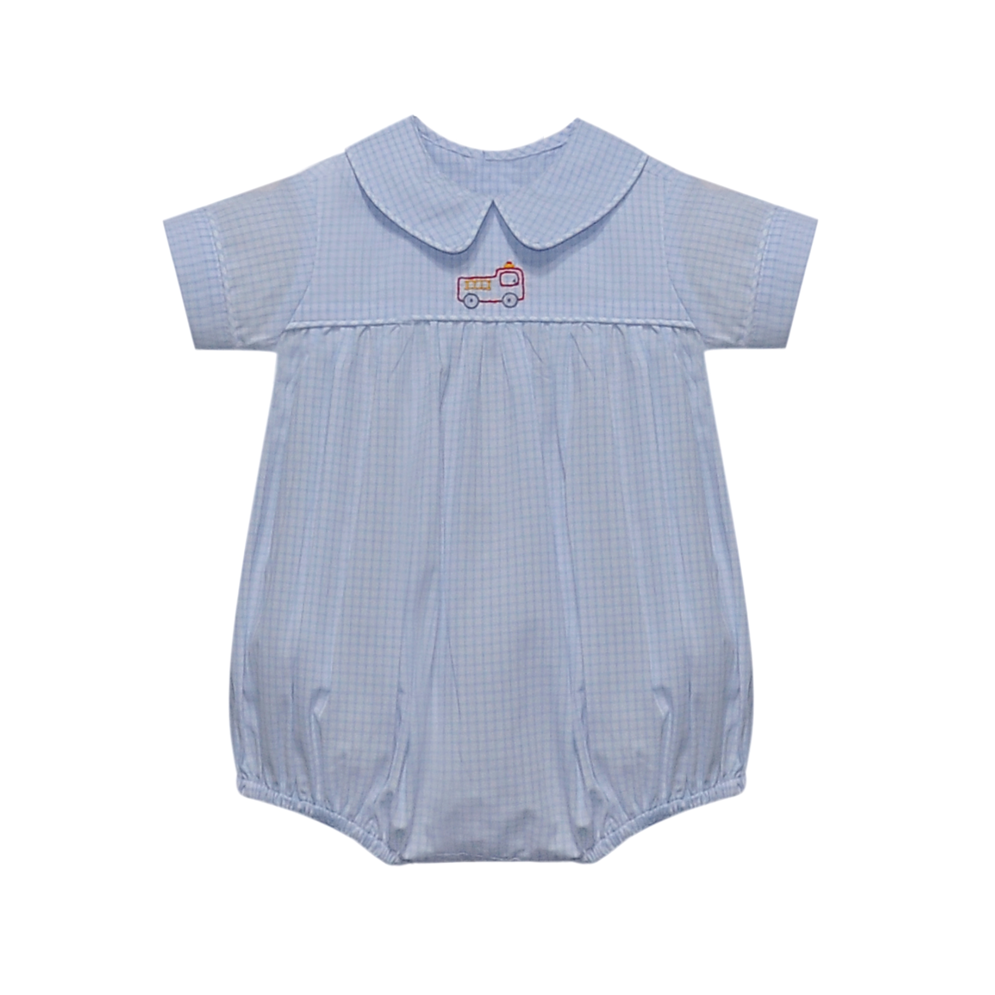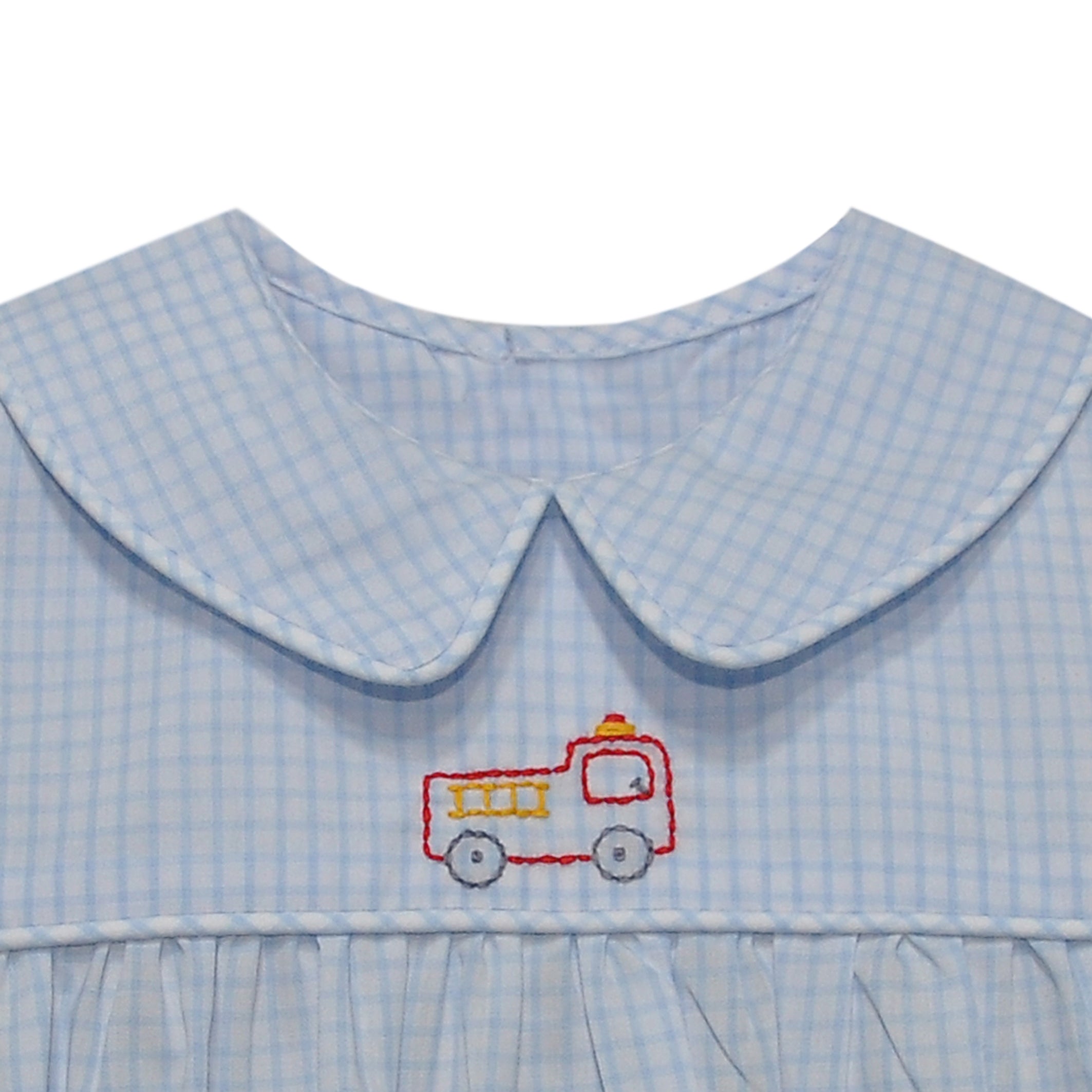 Dress your little adventurer in this charming Tate Bubble featuring a classic peter pan collar in cheerful blue check. Adorably embroidered with a fire truck design, this playful outfit is perfect for your little boy's everyday explorations or special occasions. Ready for rescue missions and imaginative play!