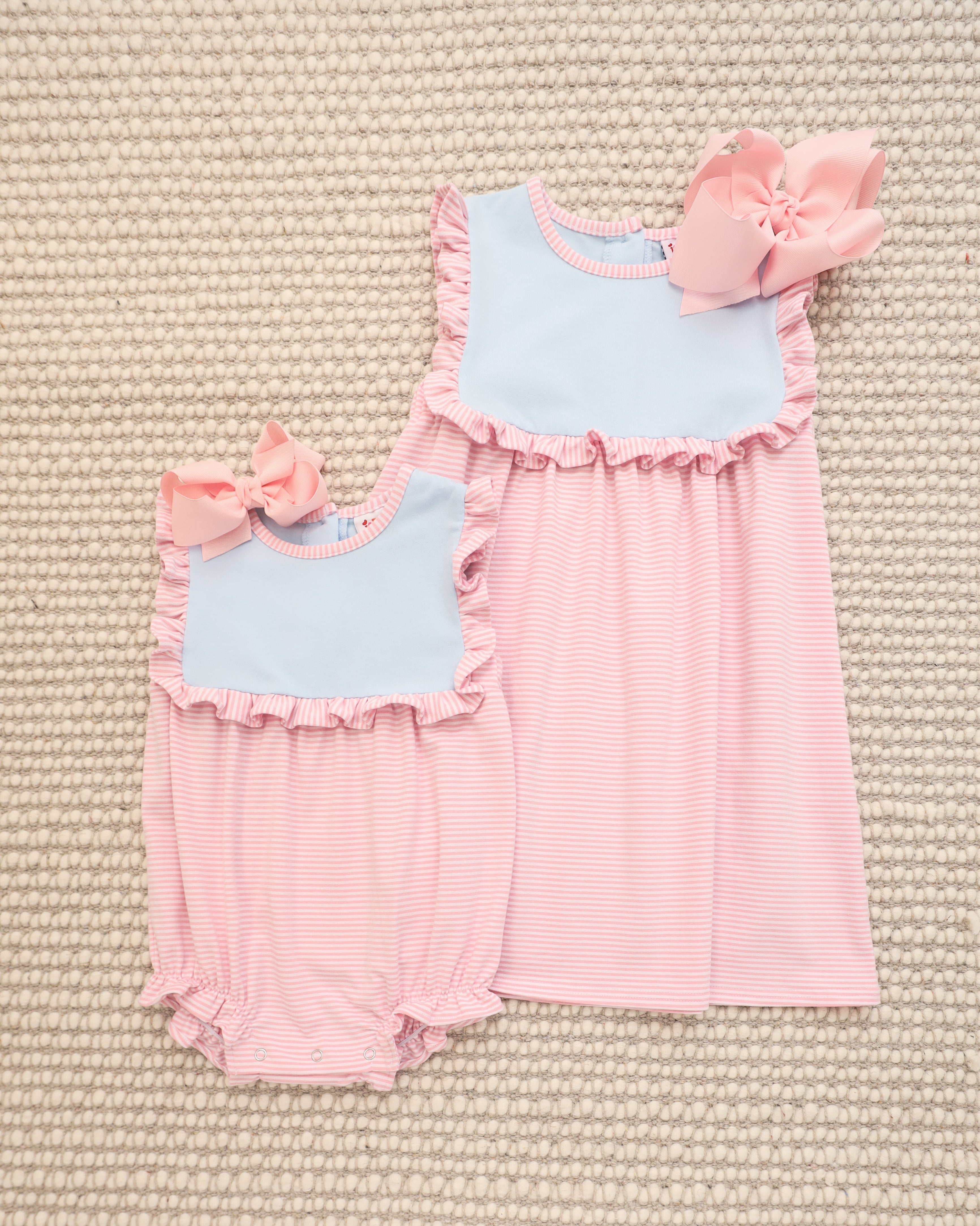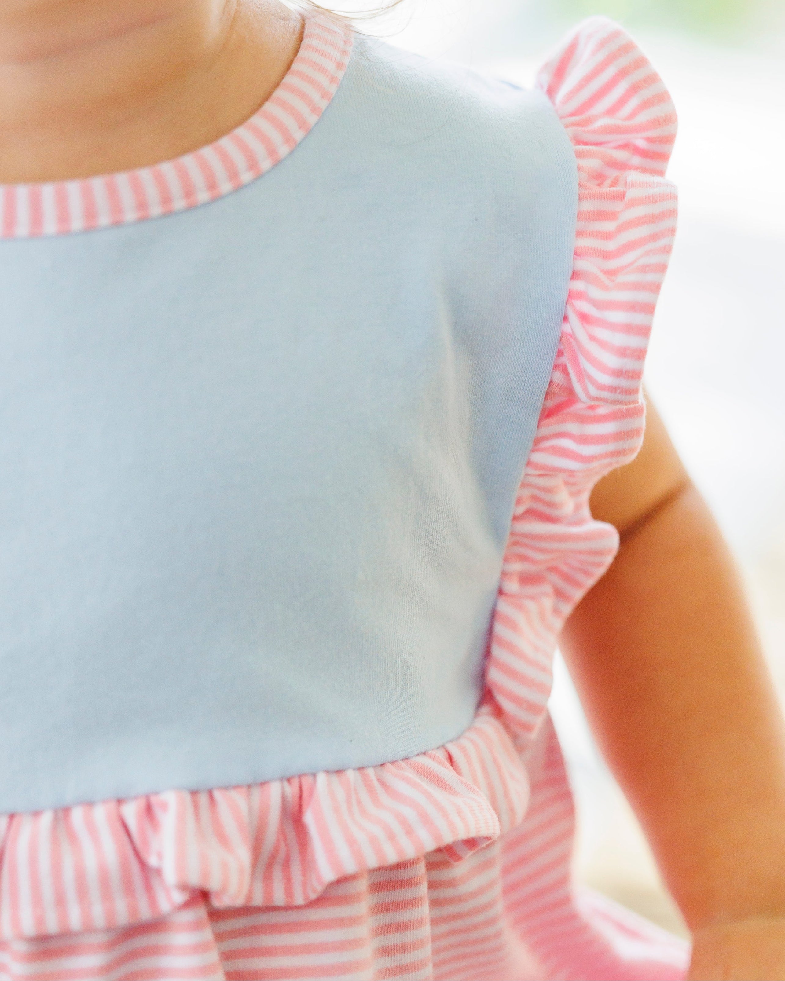 - Sleeveless bubble with light blue bodice and pink stripe ruffle details
