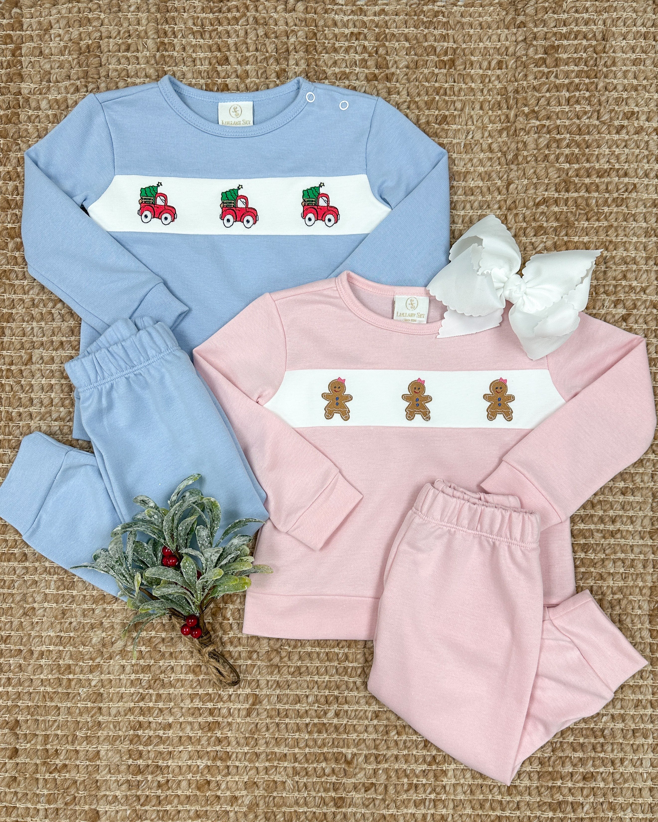 Sweet and playful, the Bayou Play Set is crafted in soft Boardwalk Blue Knit and features charming Truck with Trees embroidery for a festive touch. This cozy set includes long-sleeve top and coordinating pants, perfect for holiday play, family gatherings, or everyday comfort.