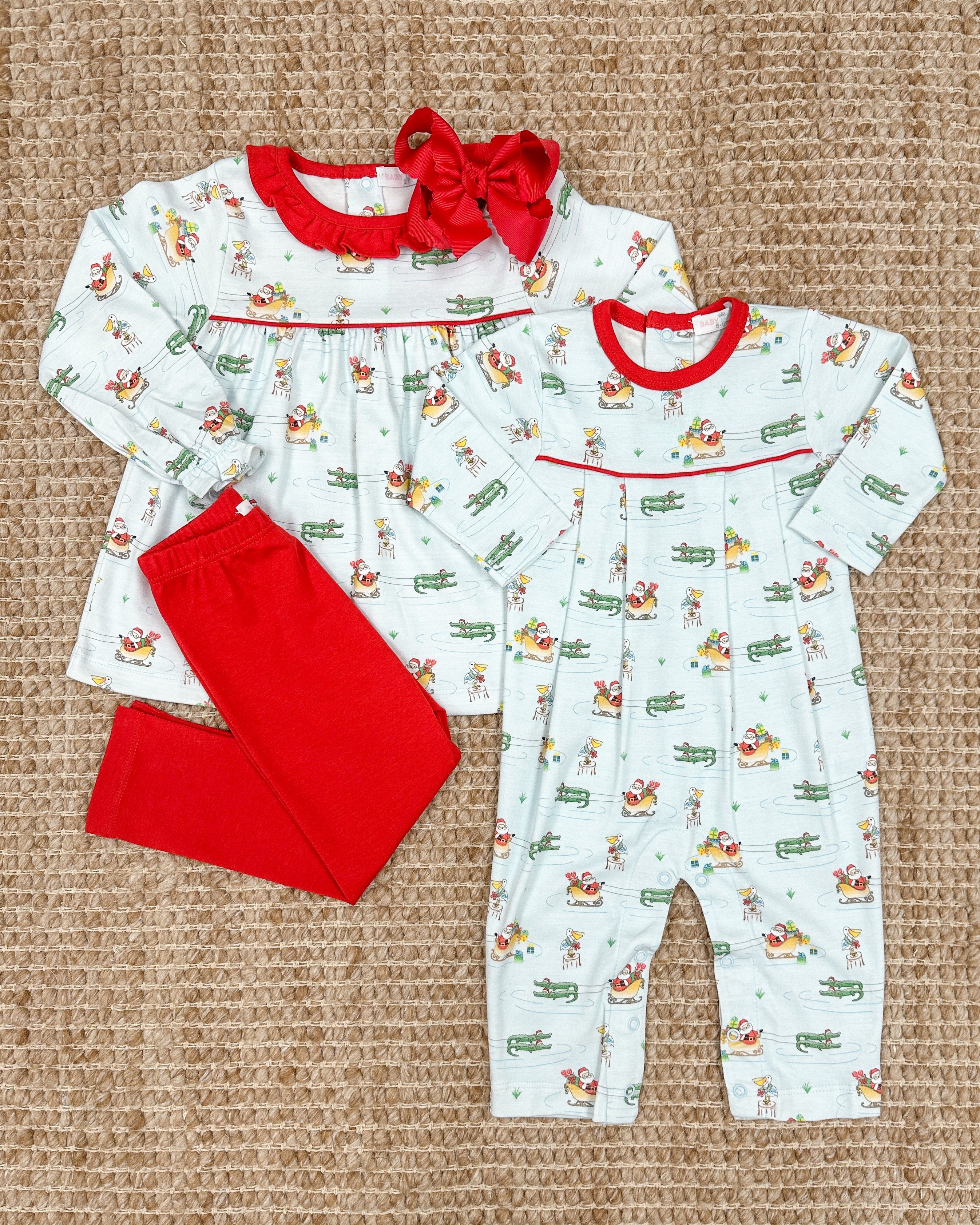 Chère, Look Who’s Pullin’ the Sleigh – C’est les Gators! (Darlin’, look who’s pulling the sleigh – it’s the gators!) Celebrate Christmas, Cajun Style, with this romper.