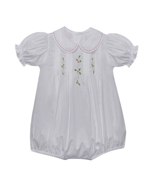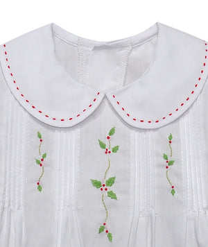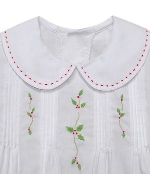 The Kay Boy Bubble in white features a festive Hollies, perfect for adding holiday cheer. With its playful Peter Pan collar, this bubble brings a delightful, vintage-inspired touch to your Christmas celebrations.