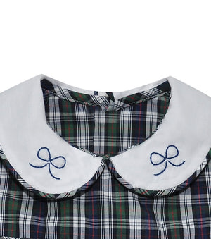 The Navy Plaid Rowan Romper brings holiday cheer with its classic plaid pattern and playful Peter Pan collar. Perfect for festive occasions, this romper combines timeless style.