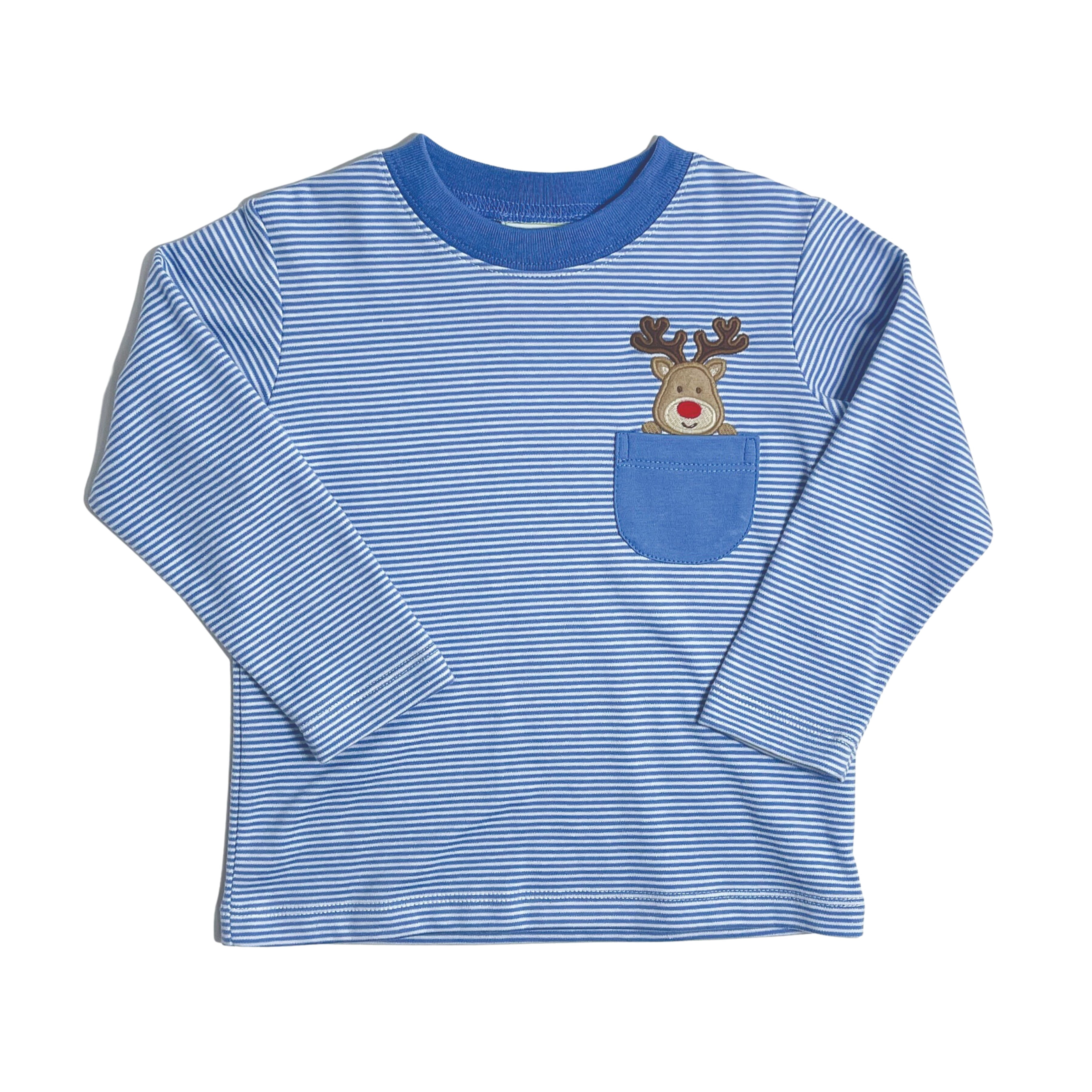 Soft, festive, and full of charm! This reindeer appliqué play tee in periwinkle bitty knit is made for your boy for the holiday season.