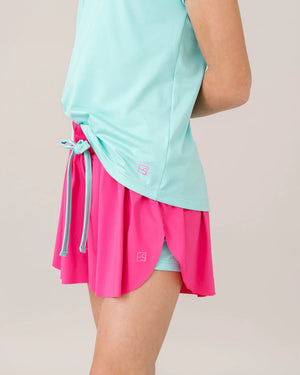 The Amber Skort is back in a color block Cotton Candy Pink and Power Pink athleisure with built-in shorts. This skort is both country club and tennis-loving approved!