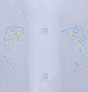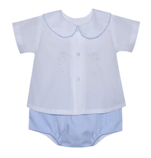 This classic white and pink diaper set is accentuated with hand stitched Birds w/Bows along the chest. Sweet pink piping along the collar and the sleeve will be perfect for your little girl.