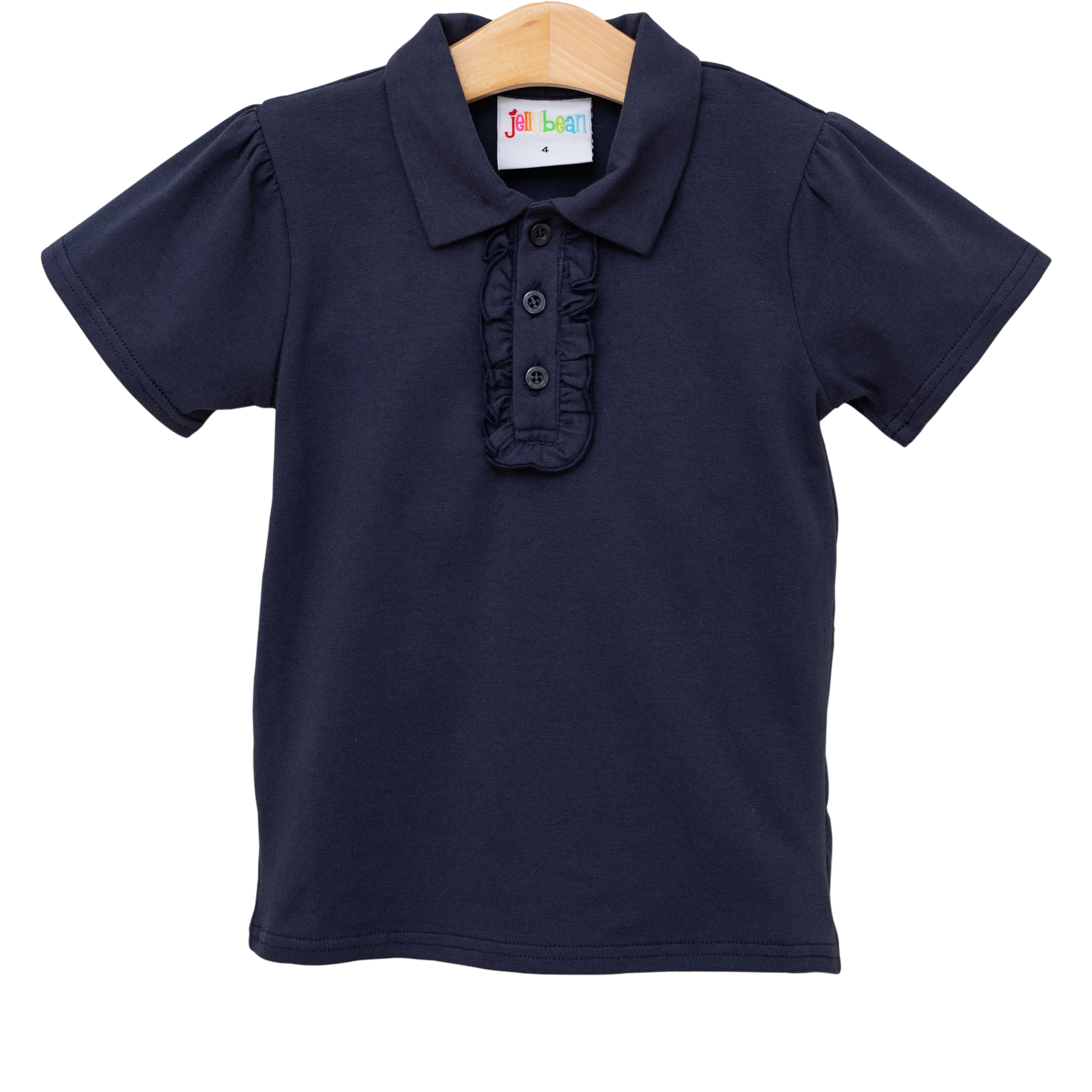 Get ready for the new school year with our Ruffle Polo Top in classic white. This playful top features ruffled details and a comfortable polo fit, perfect for any school day or dressy occasion. Say goodbye to boring uniforms and hello to stylish comfort! 95% Cotton 5% Spandex. Fits true to size. Ruffle Polo Top- Navy