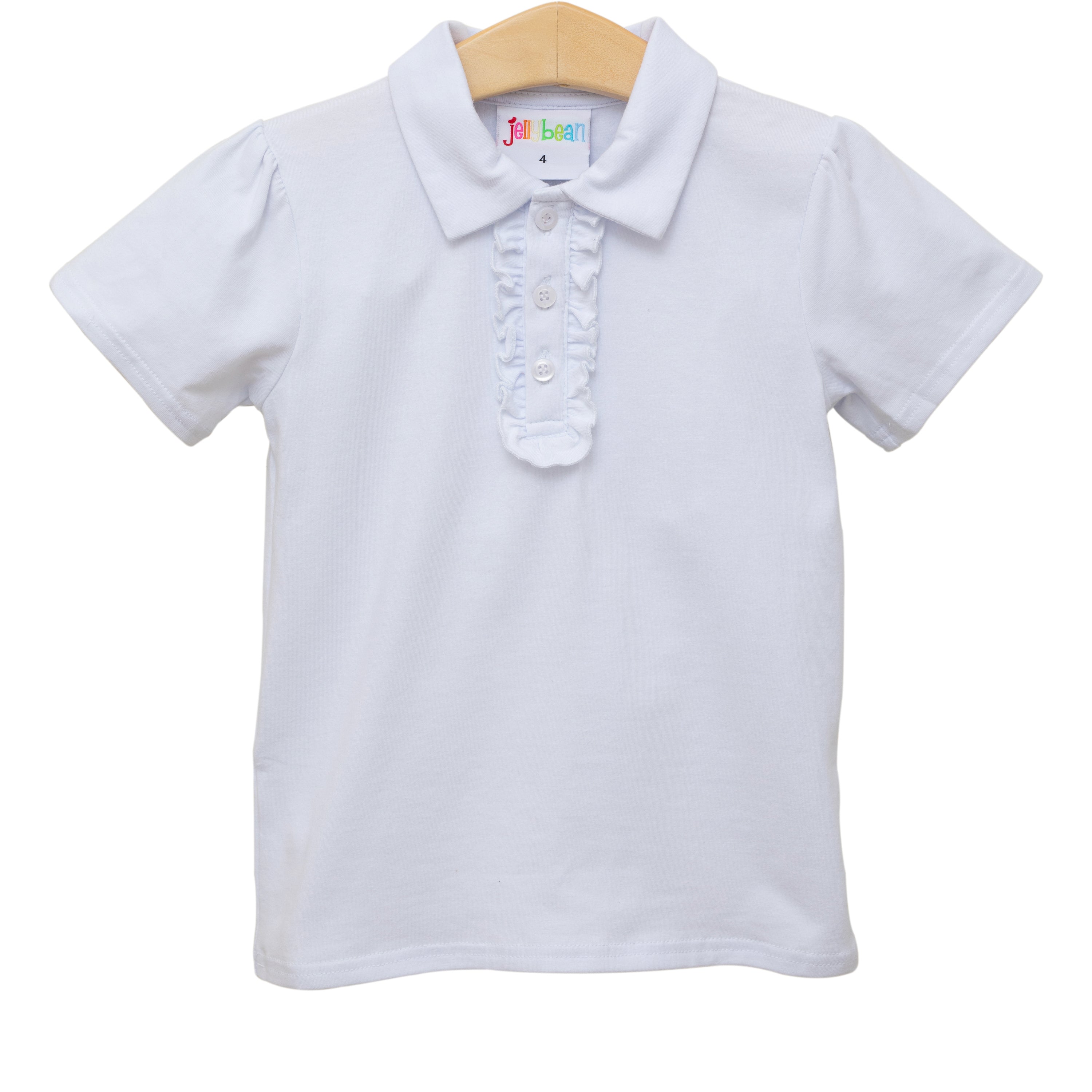 Introducing our New School inspired Ruffle Polo Top! Get ready for the new school year with our Ruffle Polo Top in classic white. This playful top features ruffled details and a comfortable polo fit, perfect for any school day or dressy occasion. Say goodbye to boring uniforms and hello to stylish comfort! 95% Cotton 5% Spandex. Fits true to size.