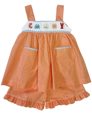 Get ready to make a splash with the Shellfish Smocked Dress! This playful and colorful outfit features a smocked fun shellfish theme and convenient pocket. Made with vibrant orange gingham fabric, it's the perfect choice for your girl's next beach adventure. So shell-abrate and add it to your cart today!
