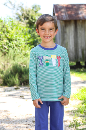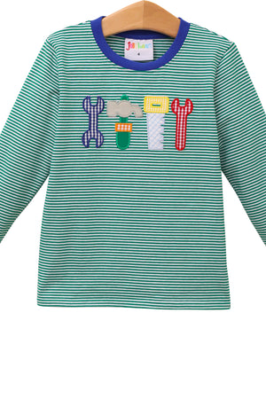 Get your little one ready to tackle any project with our Tool Romper! Made from 95% cotton and 5% spandex, this romper is both comfortable and durable. The green and white striped design adds a playful touch, while the 4 tool appliques add a touch of creativity. Complete the look with our matching older brother Tool Shirt. Perfect for your little handyman!