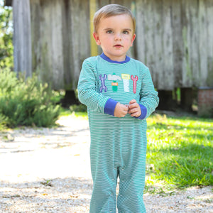Get your little one ready to tackle any project with our Tool Shirt! Made from 95% cotton and 5% spandex, this shirt is both comfortable and durable. The green and white striped design adds a playful touch, while the 4 tool appliques add a touch of creativity. Complete the look with our matching younger brother Tool Romper. Perfect for your handyman!