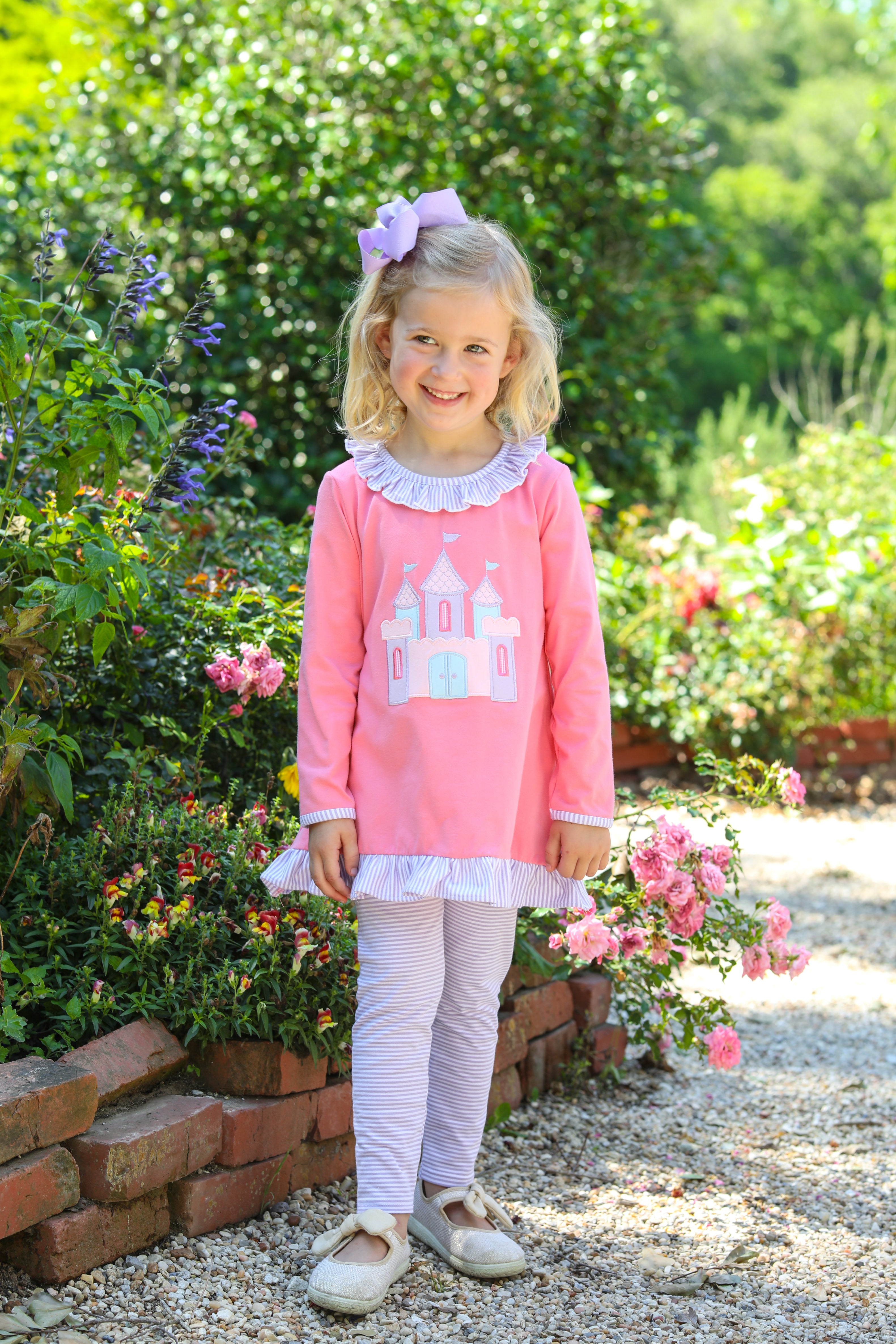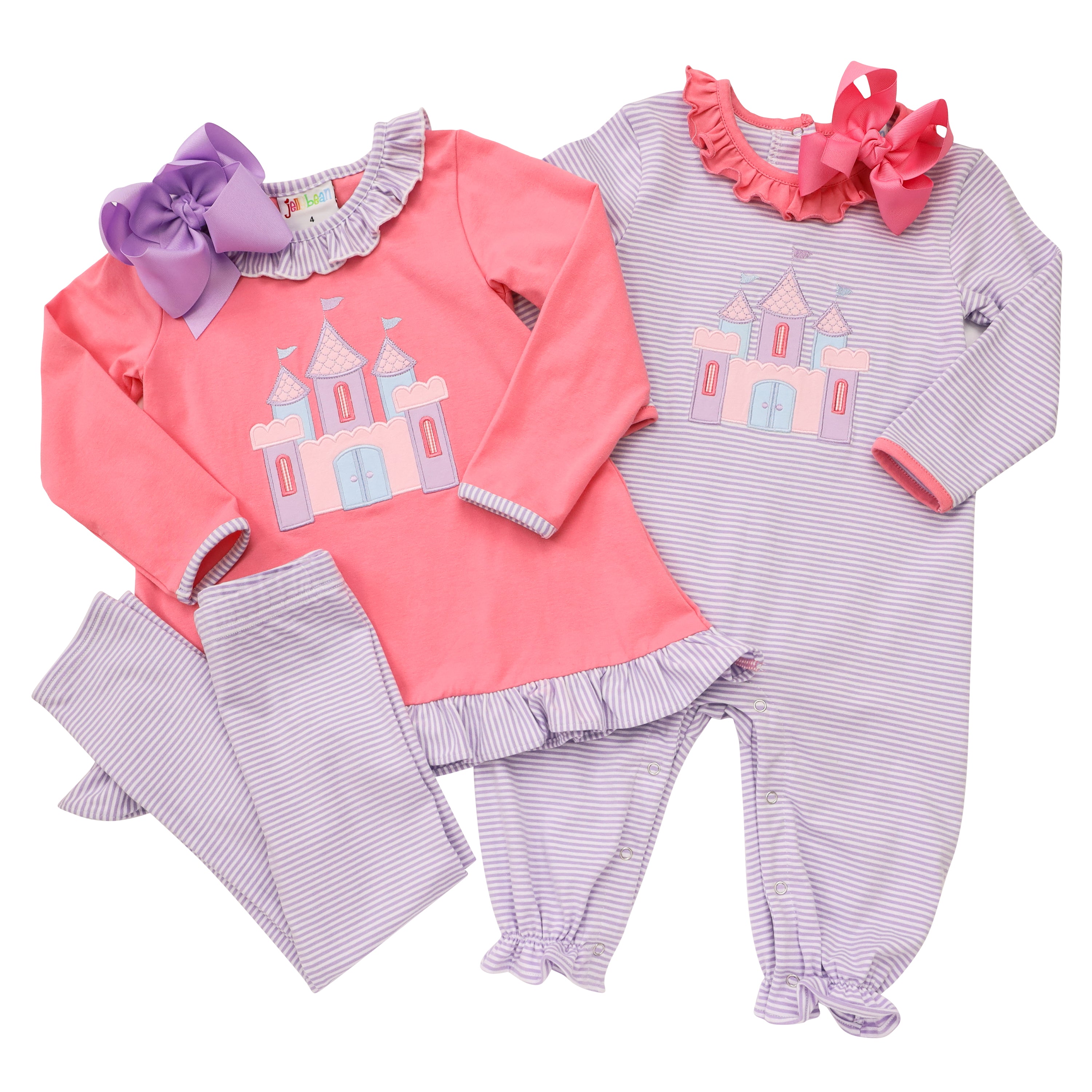 Introducing our Castle Collection. This pants set is perfect for your little one who loves all things magical! Featuring a whimsical applique castle design that will spark imaginative play and bring a touch of enchantment to their wardrobe. Order now and let your child's magic shine! Available in 4 styles. 95% Cotton 5% Spandex. Fits true to size.