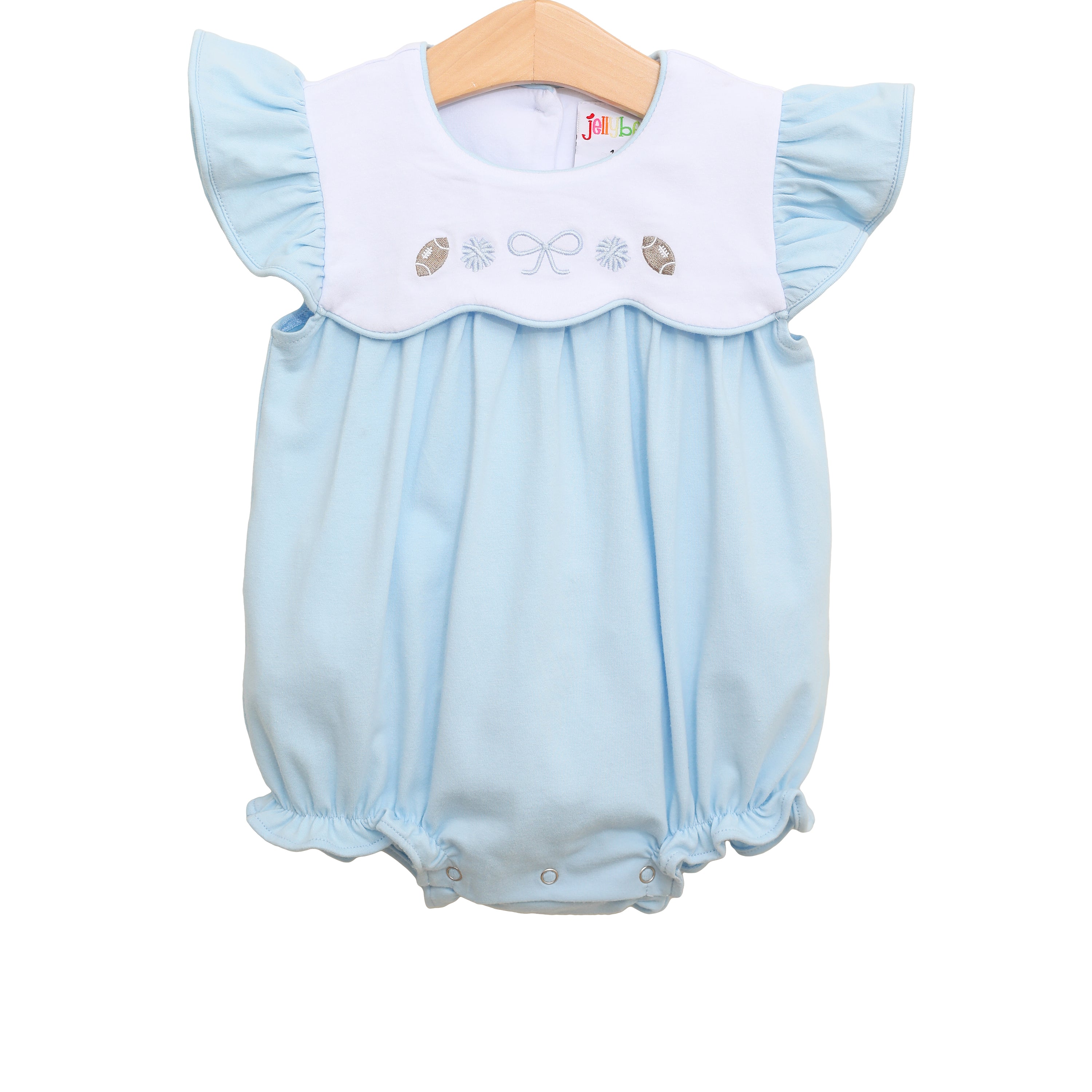 Show off your team spirit with our playful Team Spirit Scallop Bubble! This Light Blue bubble features flutter sleeves and a team-themed applique with footballs, pom poms, a bow, and scallop trim. Made with 95% cotton and 5%, it fits true to size. Don't forget to check out our matching options for siblings!