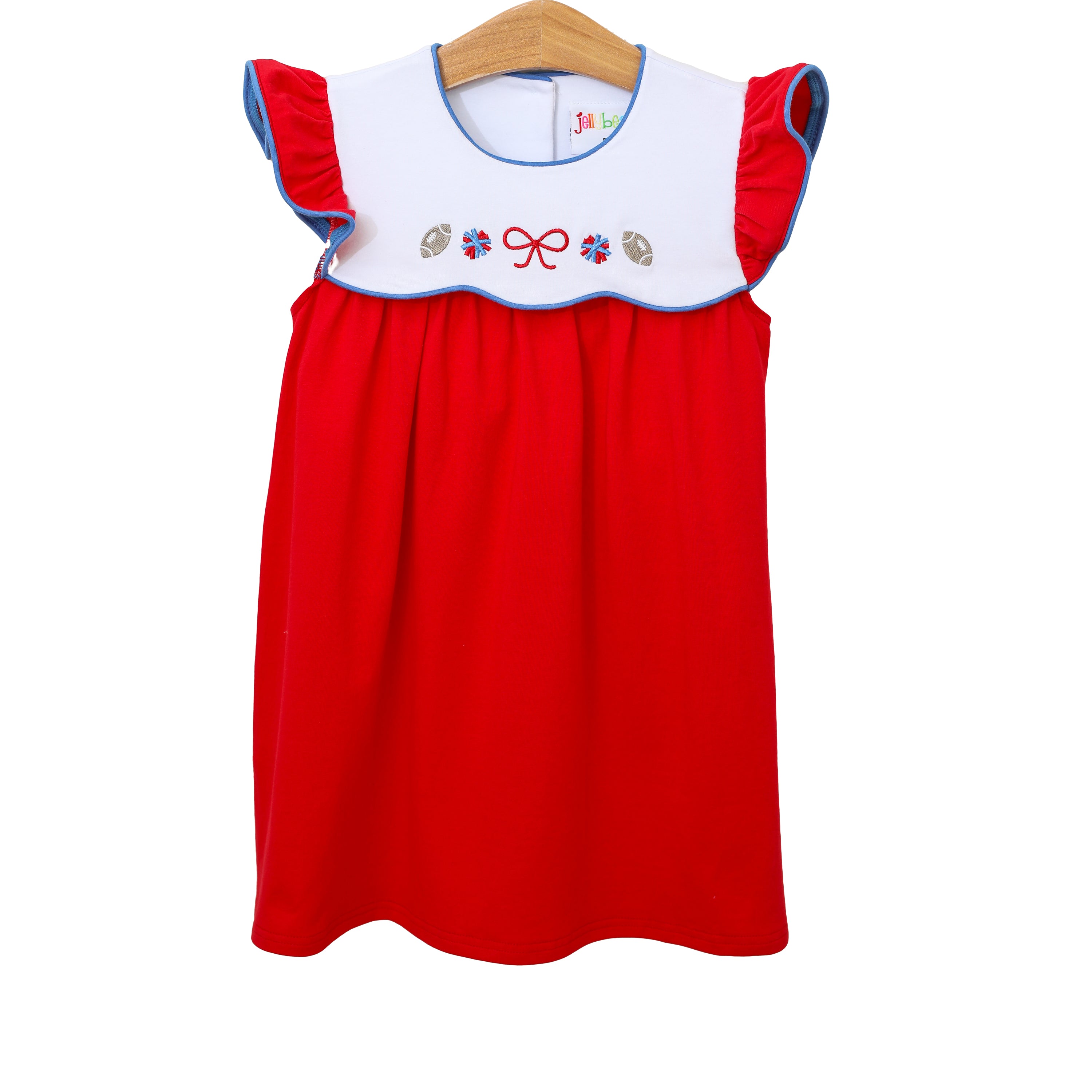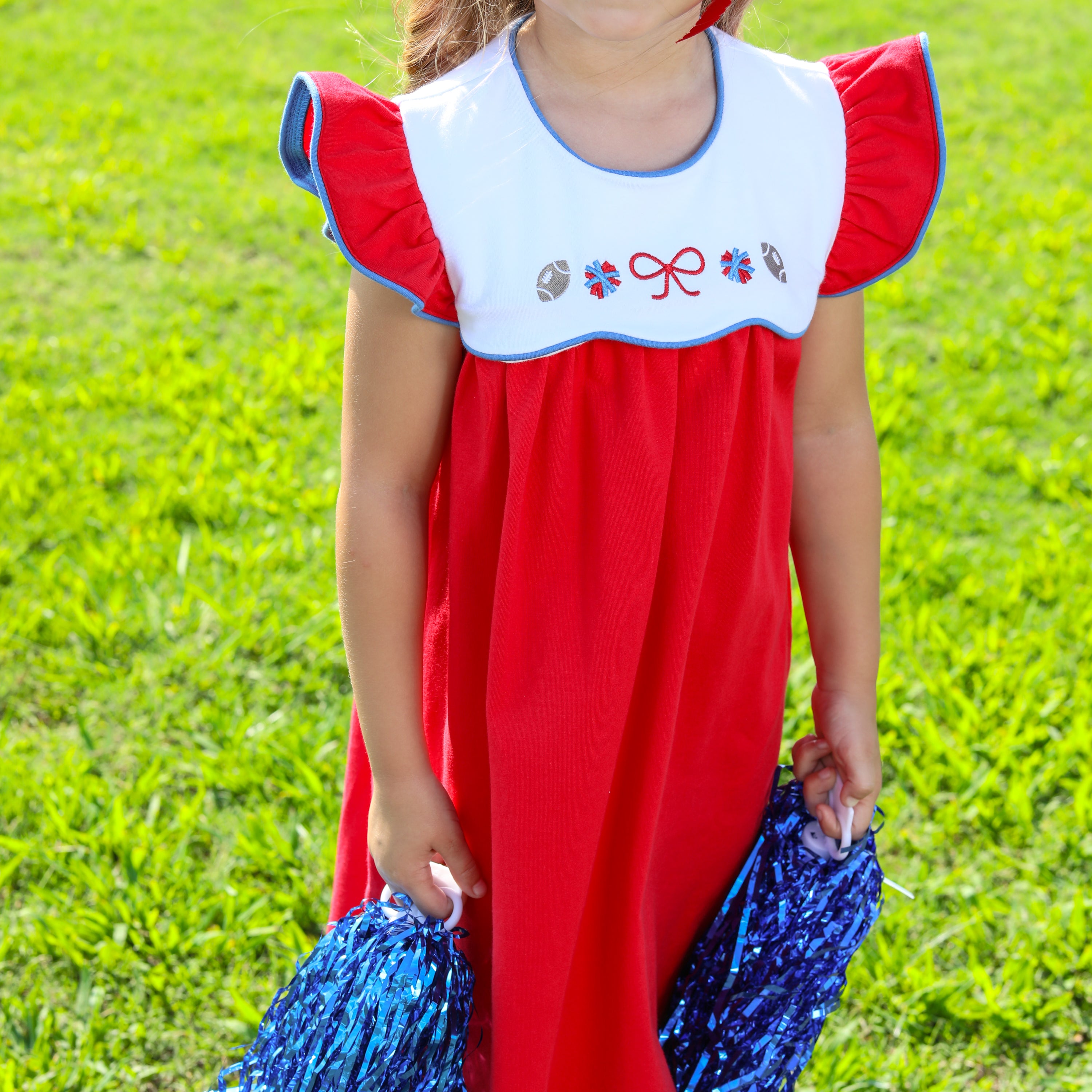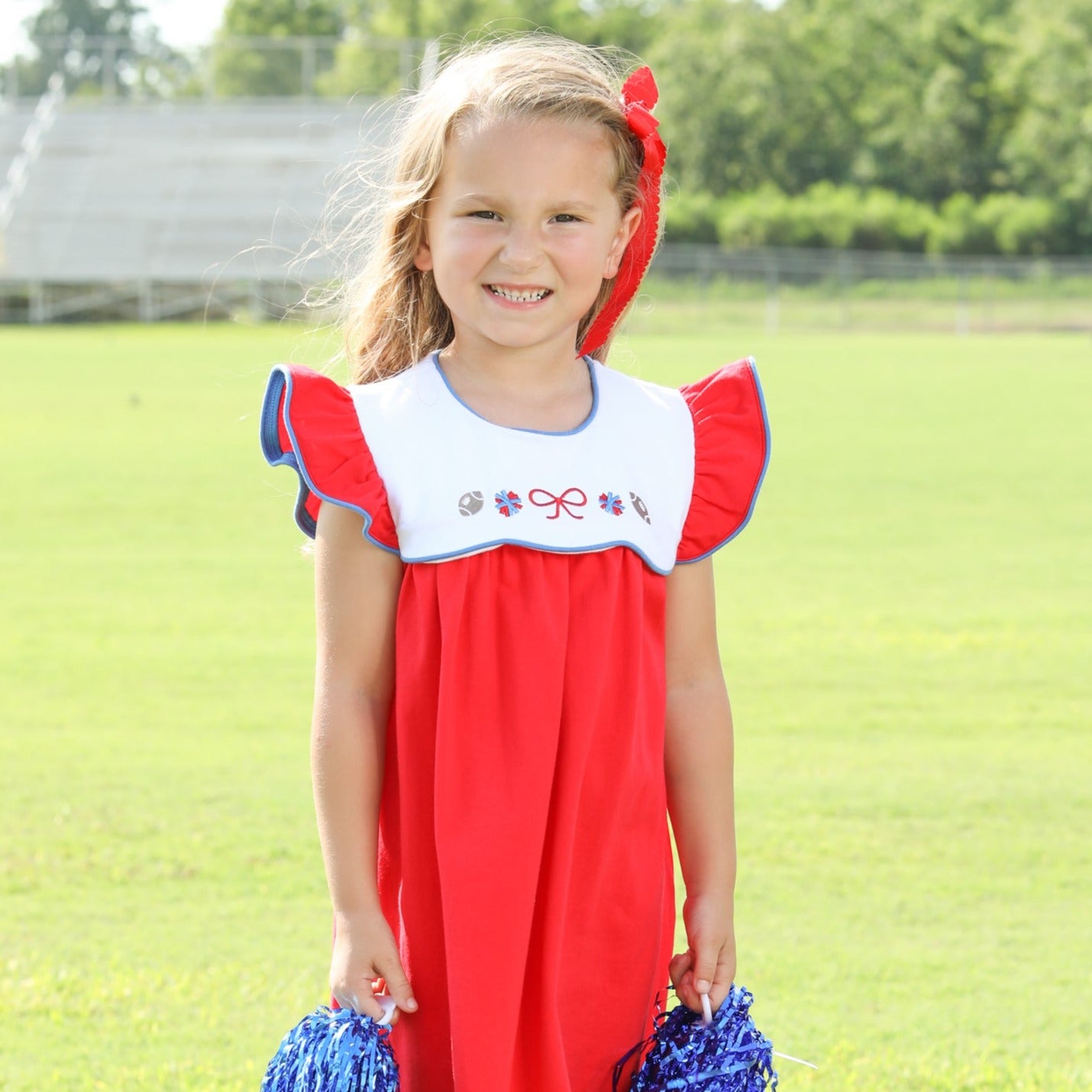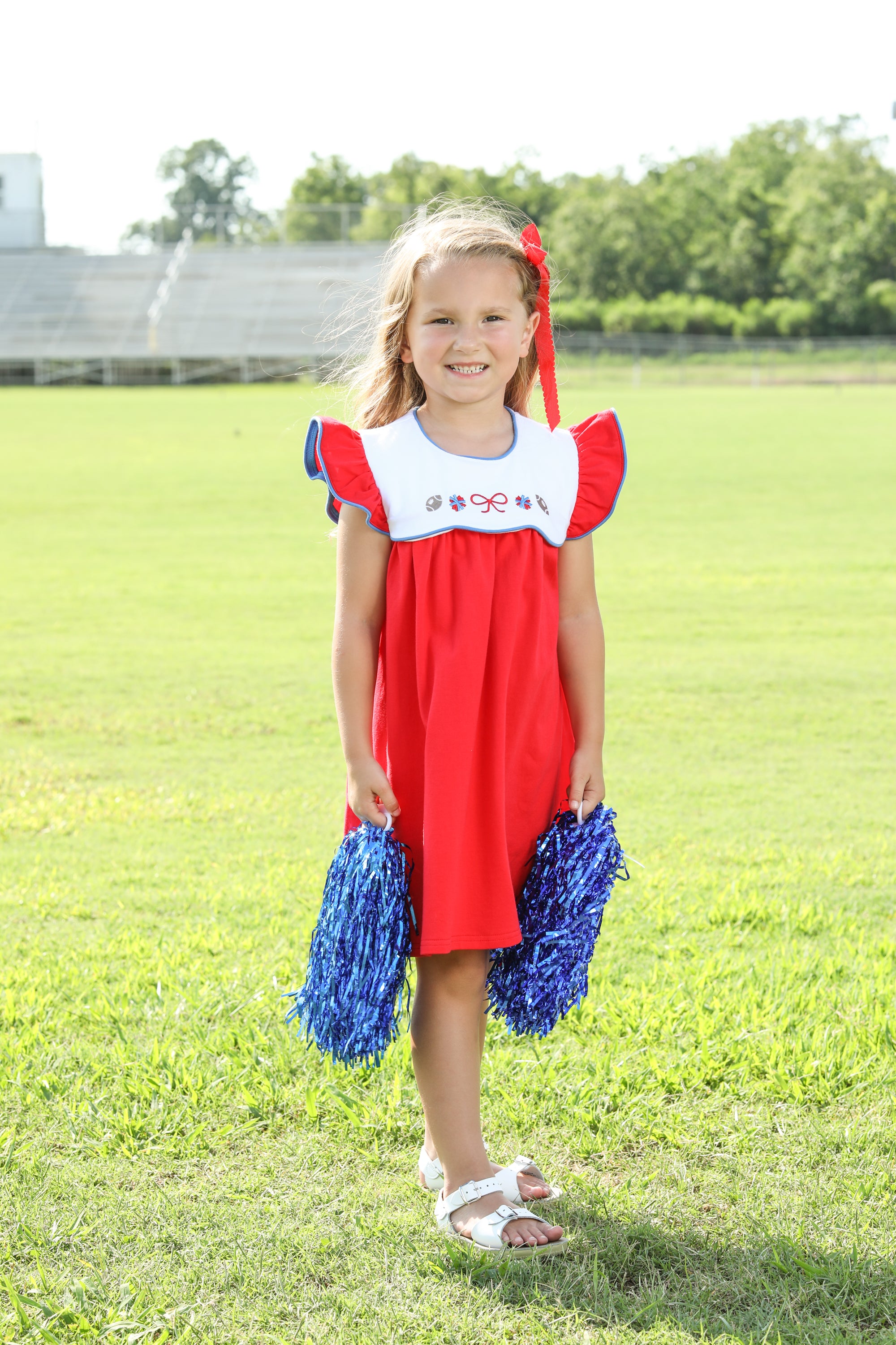 Get ready to cheer for your team in style with our Team Spirit Scallop Dress! This Red/Blue dress features flutter sleeves and a playful team-themed applique including footballs, pom poms, a bow and a scallop trim. Made with 95% cotton and 5% spandex, it's comfortable and fits true to size. Don't forget to check out our matching sibling options!