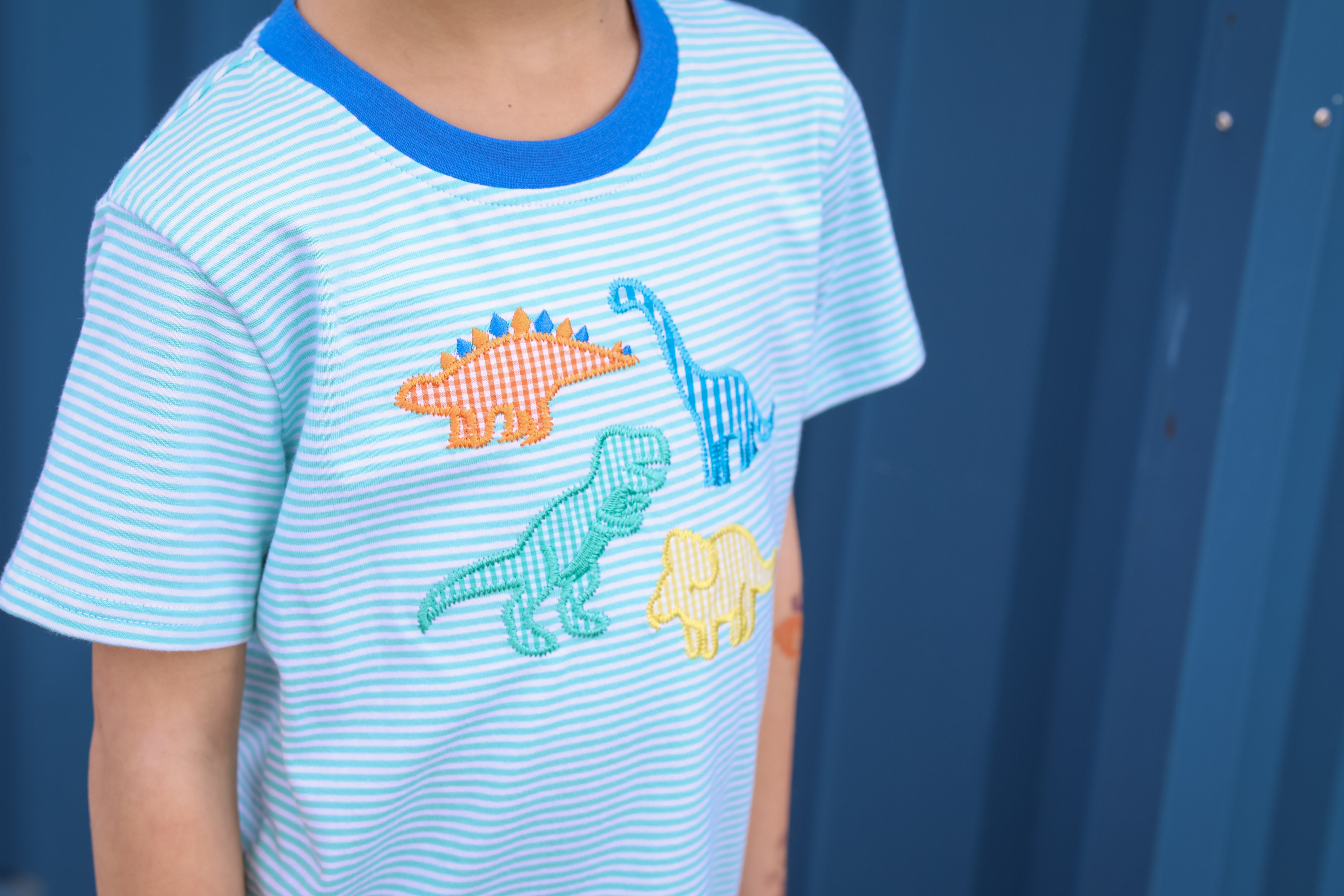 They will stomp, chomp, & roar in our Dinosaur Short Set. This knit mint stripe top trimmed in blue features playful dinosaur appliques and includes matching knit blue shorts. It's the perfect set for your dino-loving little one!