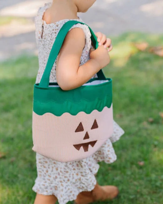 Make their trick-or-treating more magical with the Halloween Pumpkin Tote. Happy haunting is ahead for every ghost, princess, witch, or goblin this Halloween with this adorably durable orange seersucker and green cotton tote.