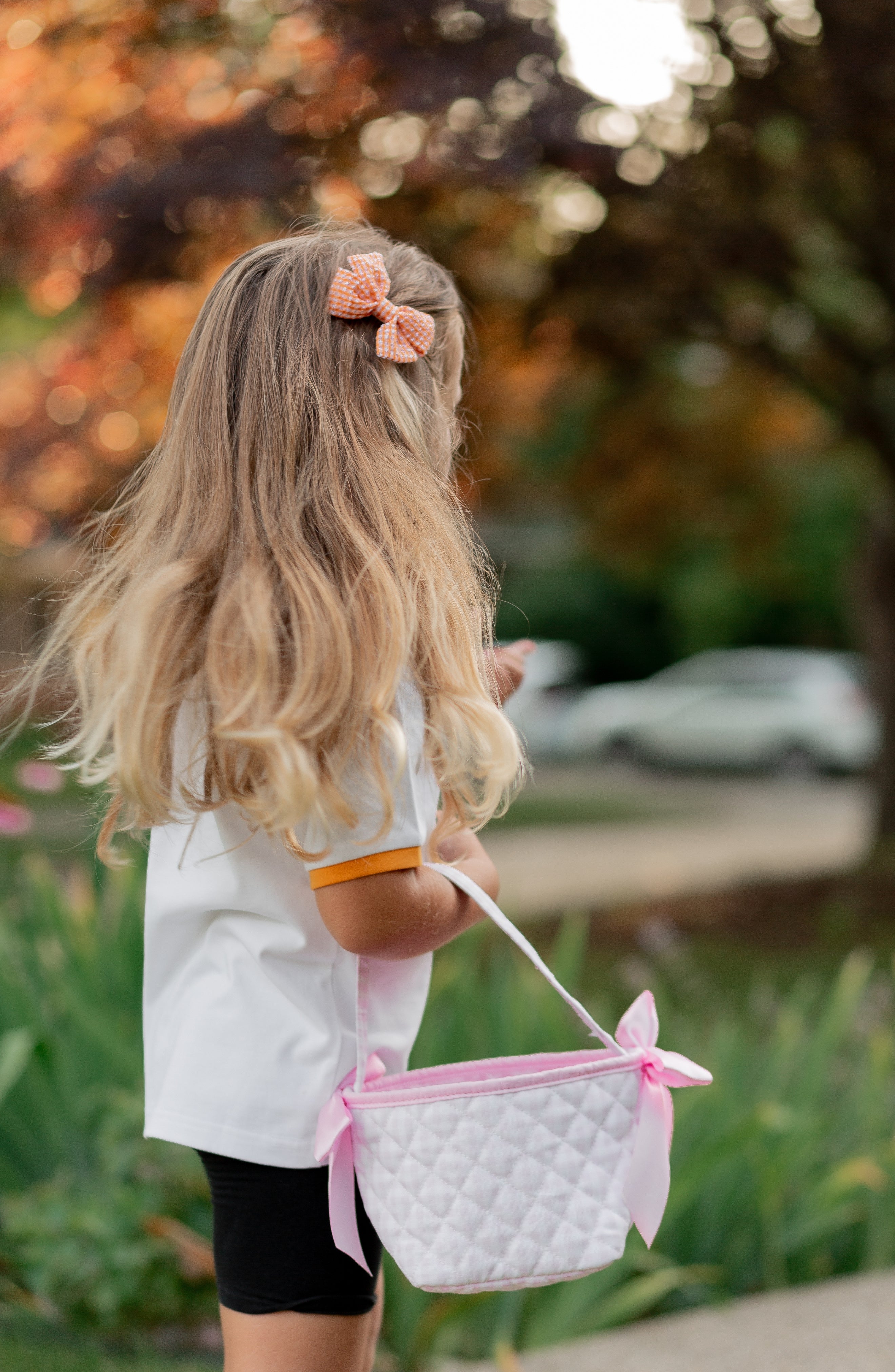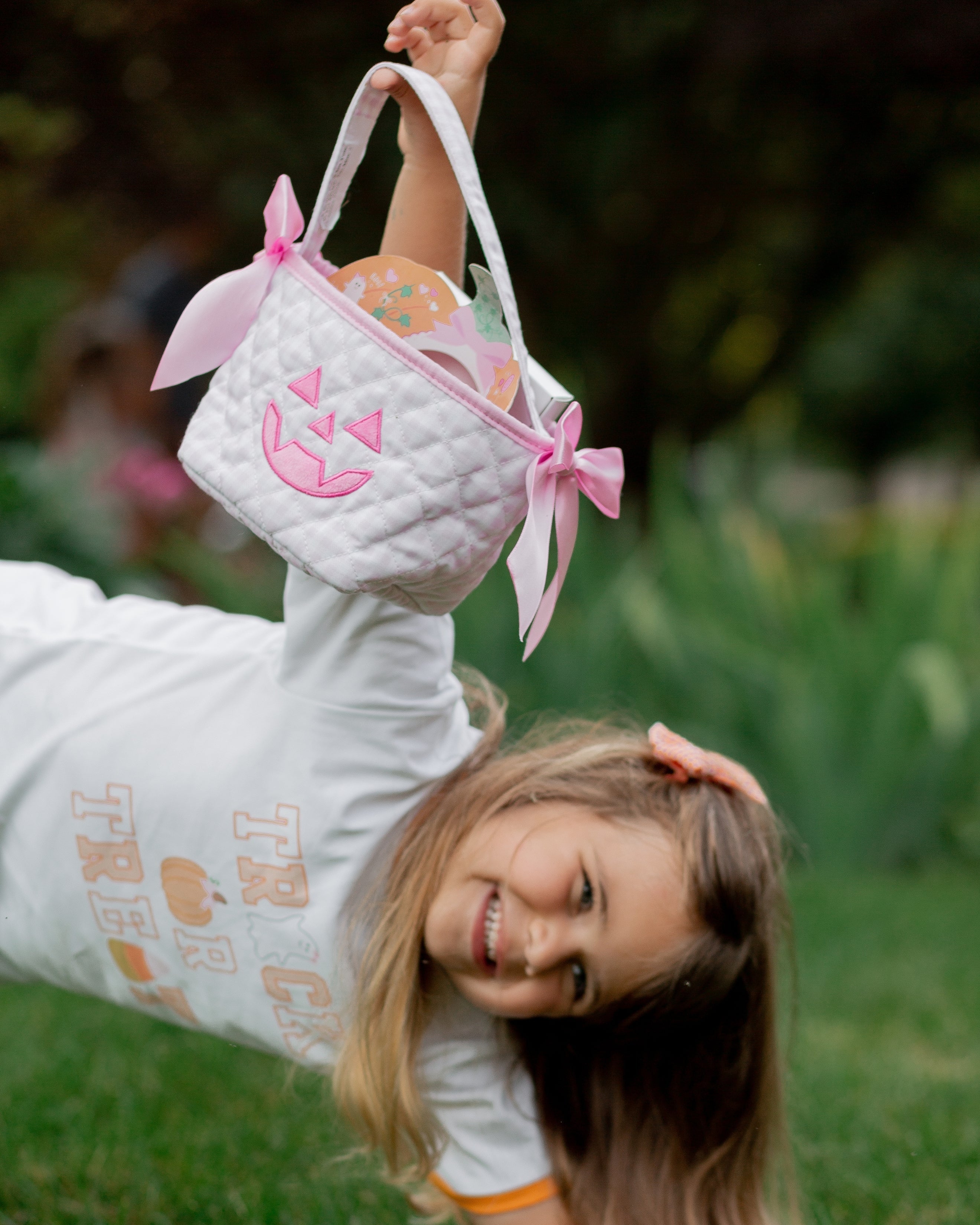 This adorable tote is adorned with pink satin bows and jack-o-lantern velvet applique to add Halloween sweetness to every little girl's trick-or-treat.