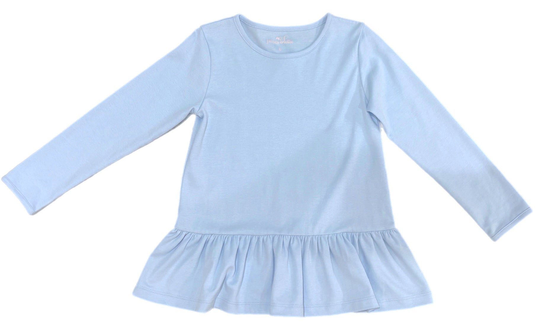 Get ready to fall in love with the Peggie Peplum Knit Top in Light Blue! Made with Pima cotton, this top is luxuriously soft and perfect for all-day comfort. The long sleeves keep you warm, A must-have for any wardrobe. Pair with any of the Scalloped Leggings for a prefect look!
