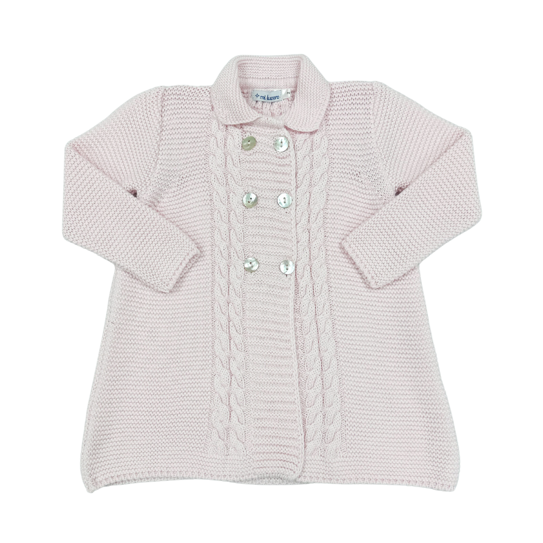 Wrap your little one in timeless elegance with this beautifully knit coat. Crafted in a soft pink, it features intricate cable detailing along the front and a classic collar for a refined, vintage-inspired look. The double-breasted button design adds both style and practicality, making it easy to layer on chilly days. Cozy, comfortable, and irresistibly sweet, this knit coat is the perfect finishing touch for keeping your little one warm in effortless charm.