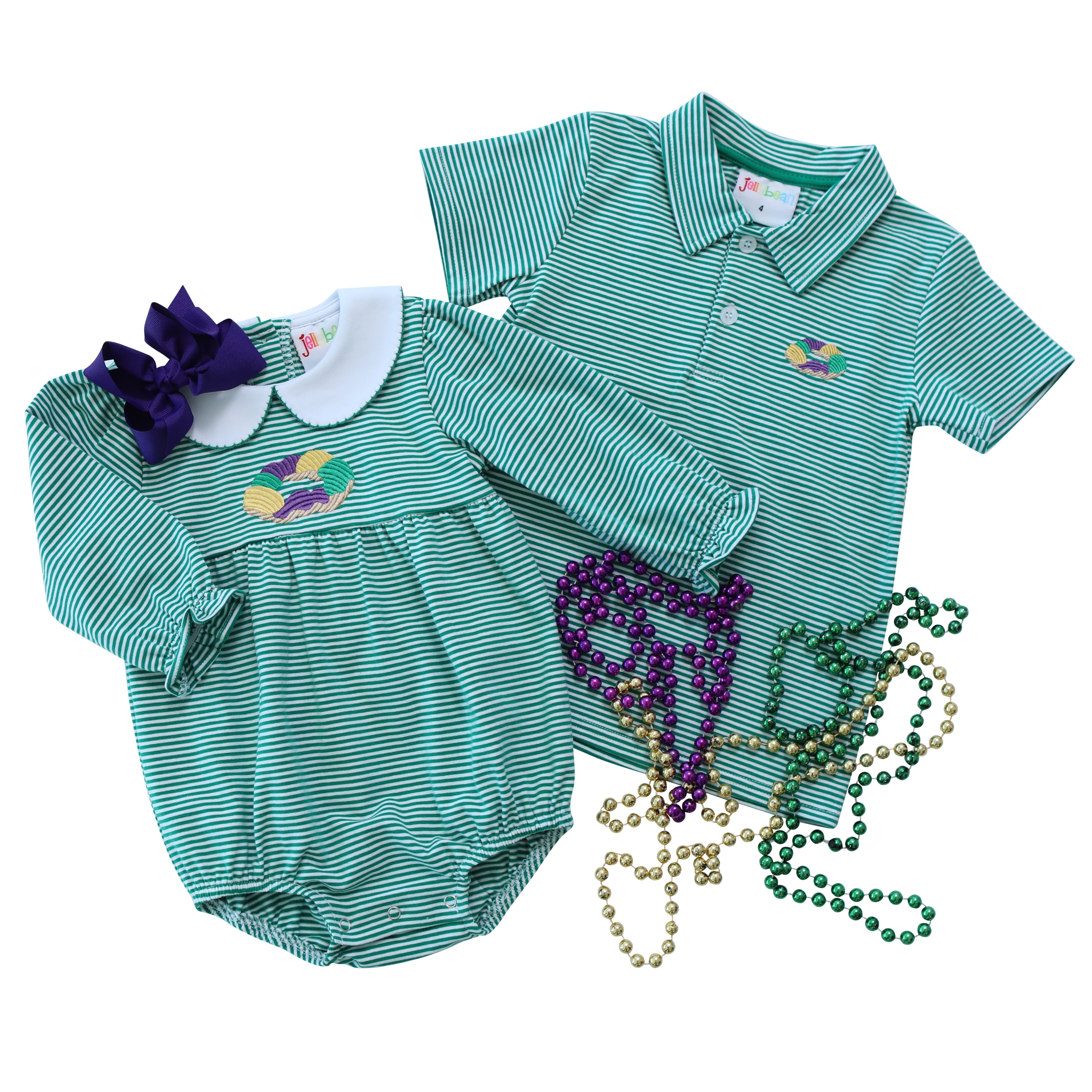 Let’s get this party started with the King Cake Embroidery Bubble! This adorable bubble is perfect for partying on a Tuesday!