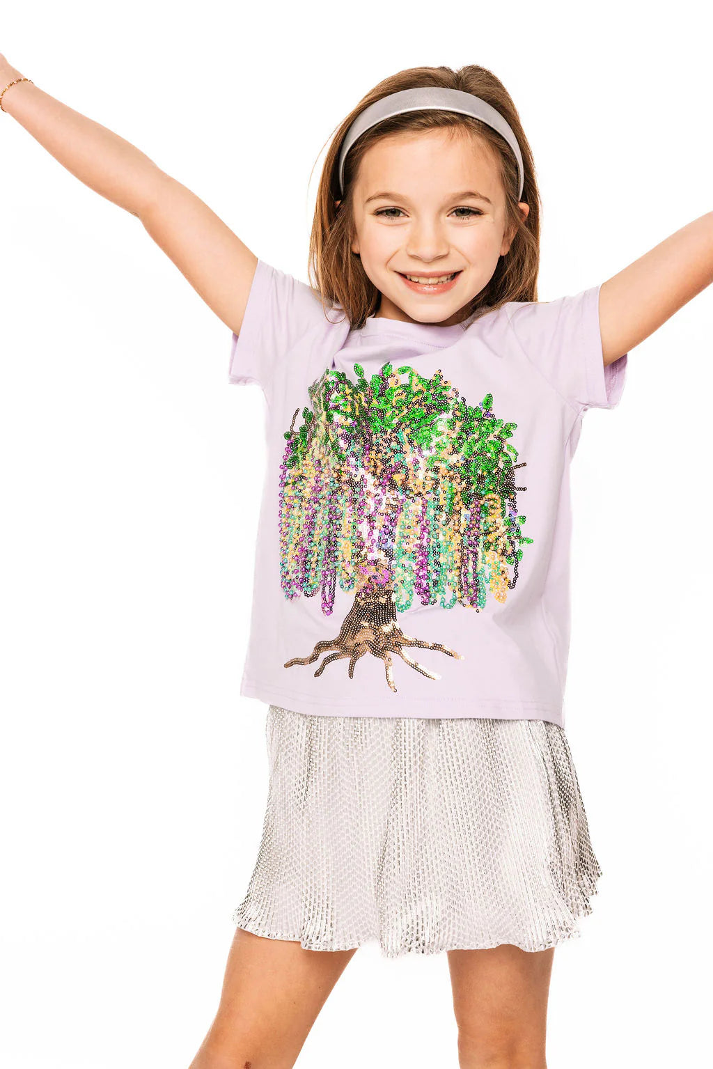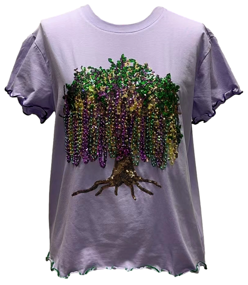 Twirl into sparkle mode with this lavender tee that's basically a wearable work of art! Delicate frill edges frame the neckline and sleeves for an extra touch of charm, while an enchanting tree design comes to life in shimmering full sequin beads. Perfect for anyone who believes more sparkle is always the answer.