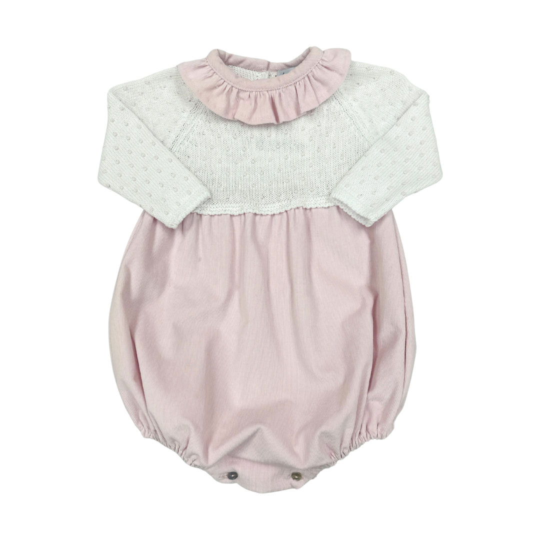 This adorable bubble brings classic charm and cozy comfort together in the sweetest way. The soft corduroy body in a gentle pink pairs beautifully with the knitted white top, adorned with subtle dots and a ruffle collar. Long sleeves keep her warm, while the lightweight feel ensures all-day comfort from tummy time to outings. Finished with convenient button fastenings for quick and easy dressing, this darling piece offers both elegance and everyday practicality.