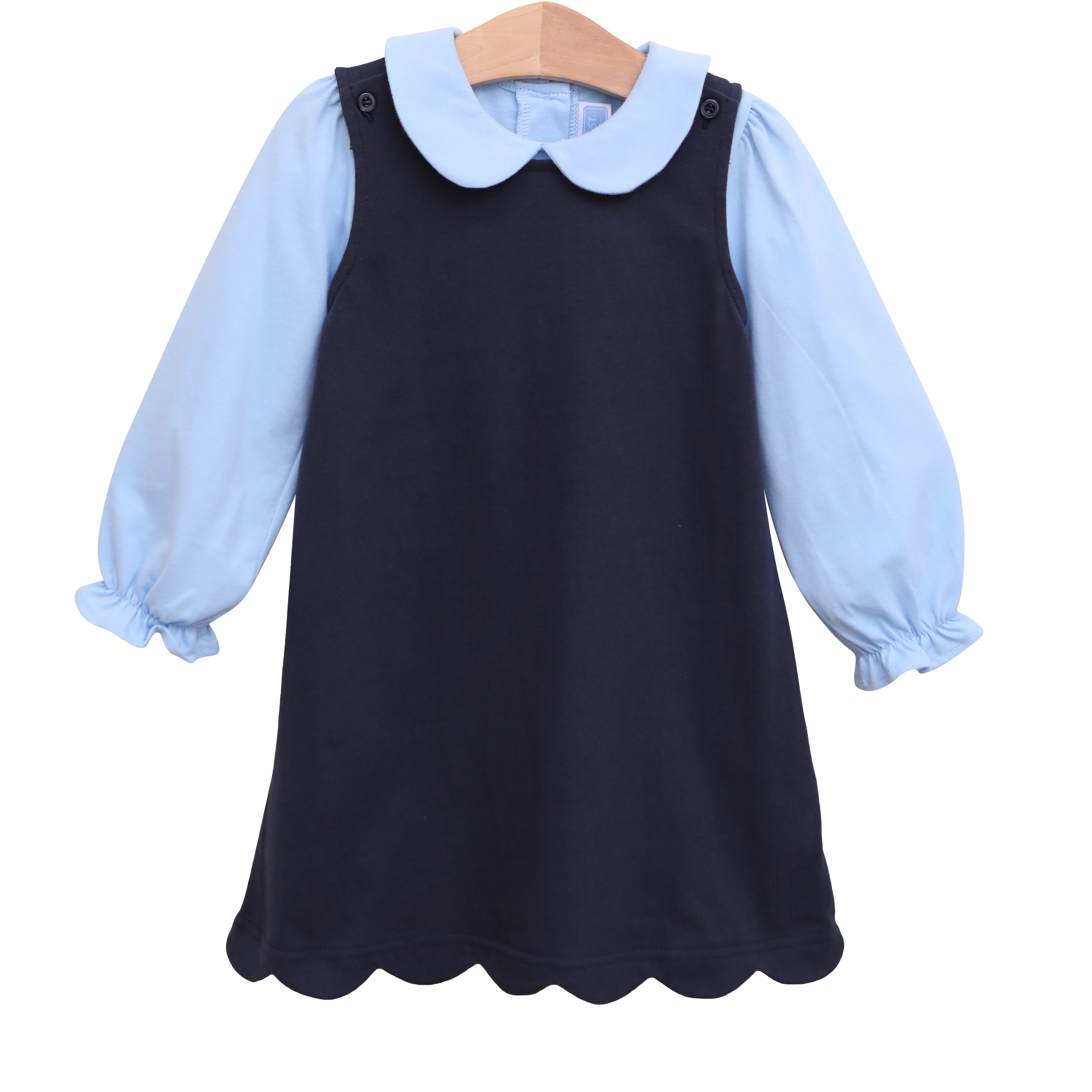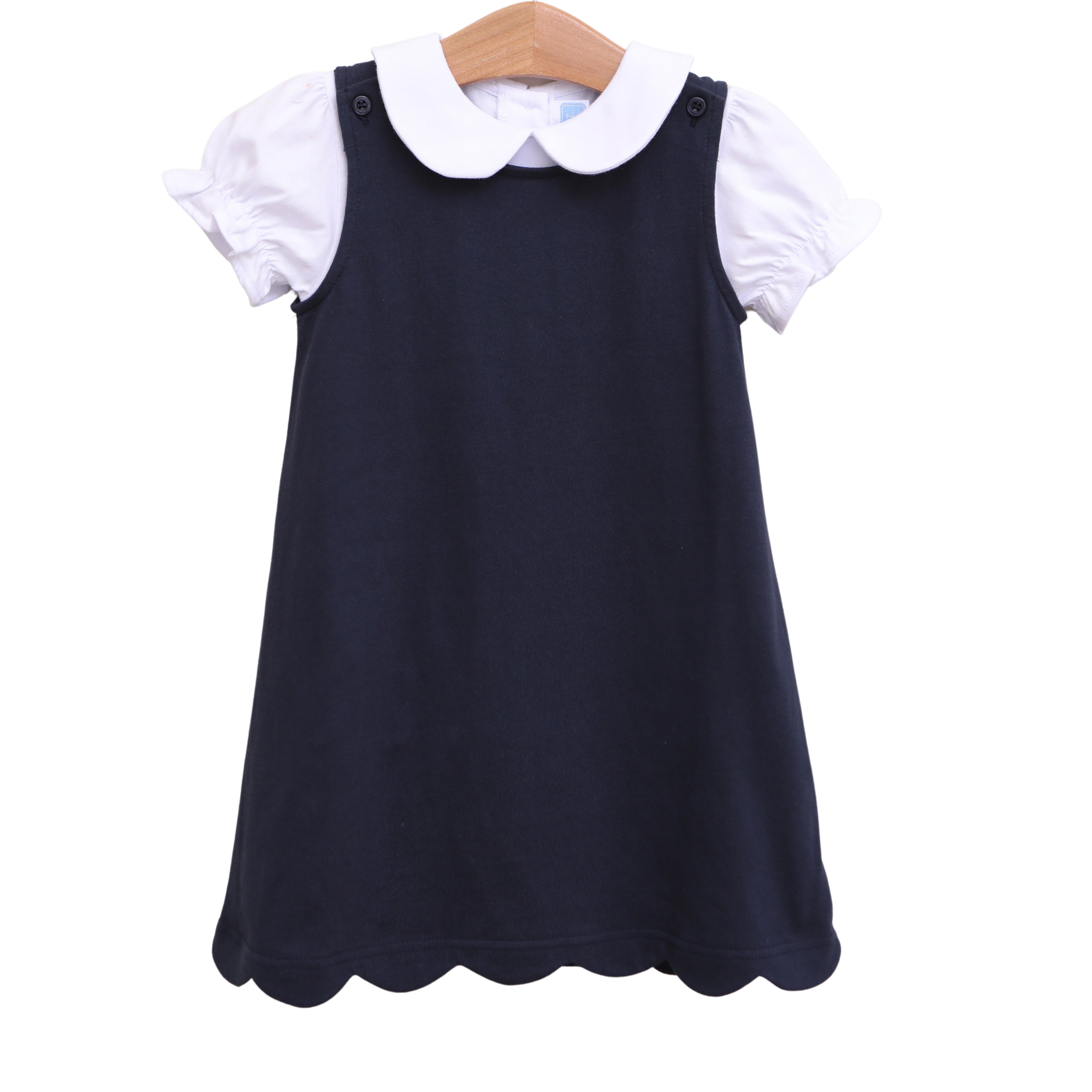 This navy scalloped jumper dress is perfect for back-to-school days. Its charming scalloped trim adds a playful touch, making it easy to pair with any back-to-school tops for a cute and comfortable outfit.