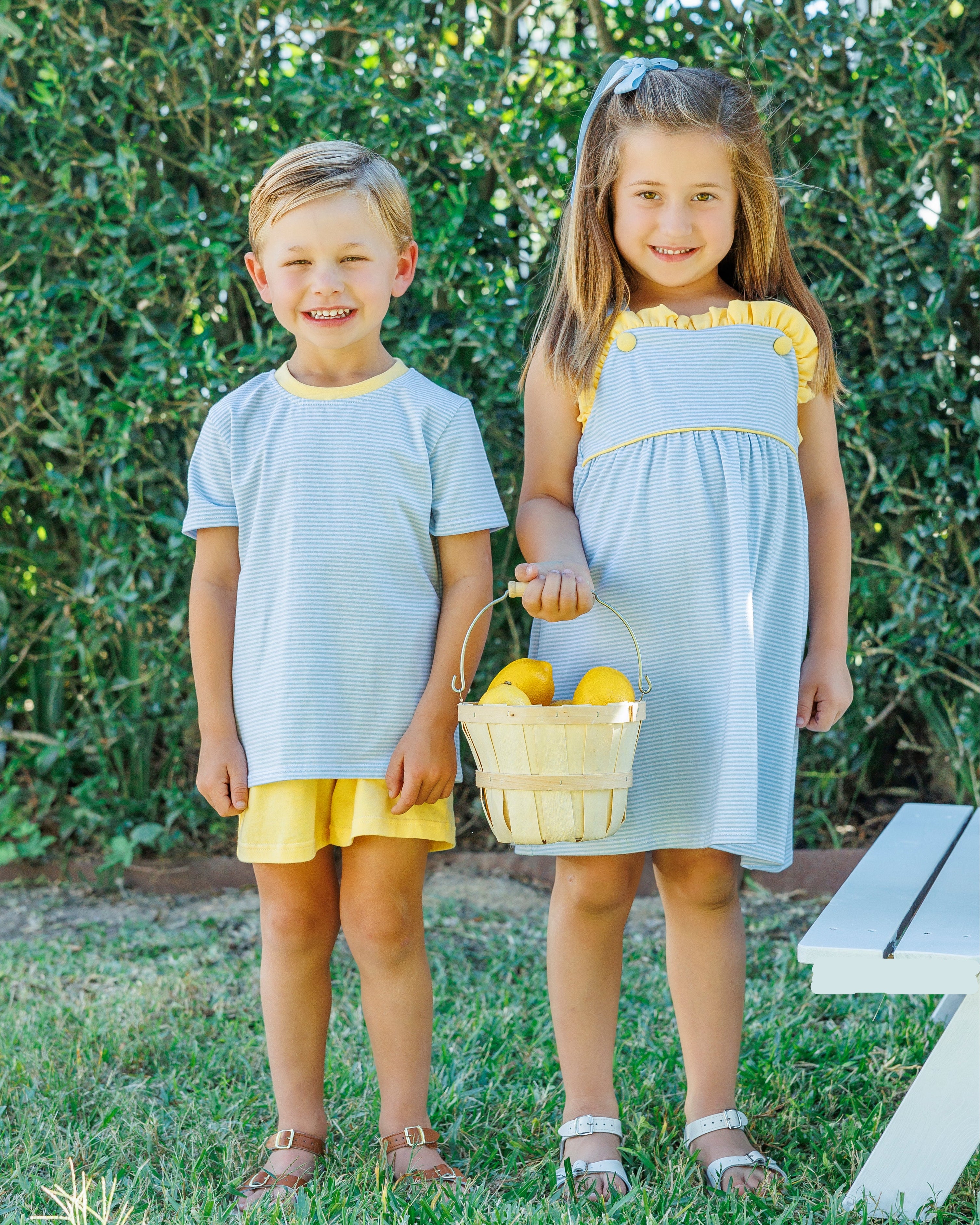 Your boy will be cool & comfy this summer with our classic Graham Short set in Light Blue Stripe and Yellow