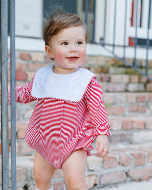 Introducing our Jane Bubble! This red striped treasure features a charming square collar and snuggly long sleeves that keep your little girl cozy during holiday adventures. The playful bubble silhouette adds a bounce to every step as she explores the colorful wonders of fall! Perfect as-is or add your personal touch.