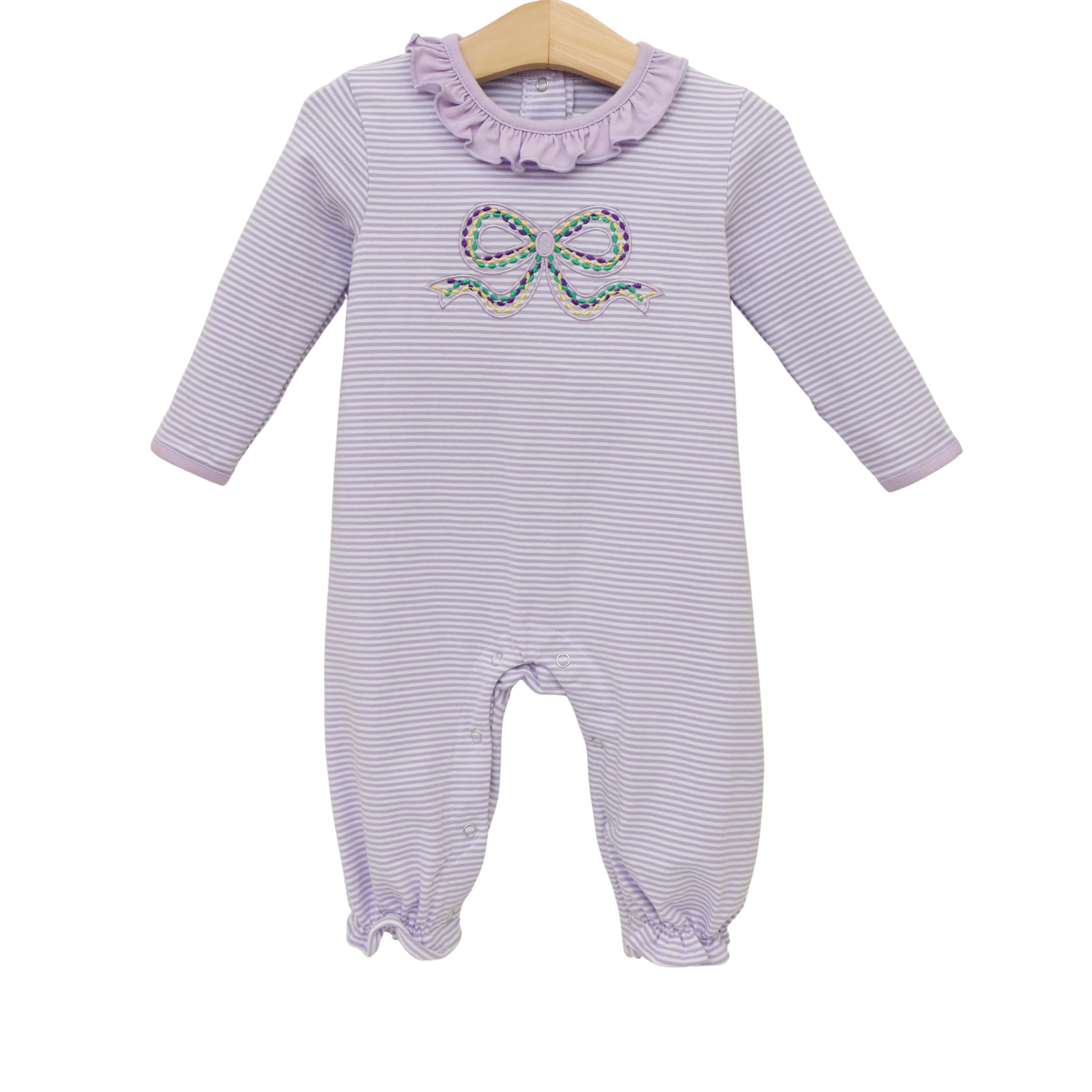 - Featuring a bow with embroidered Mardi Gras beads in the traditional colors