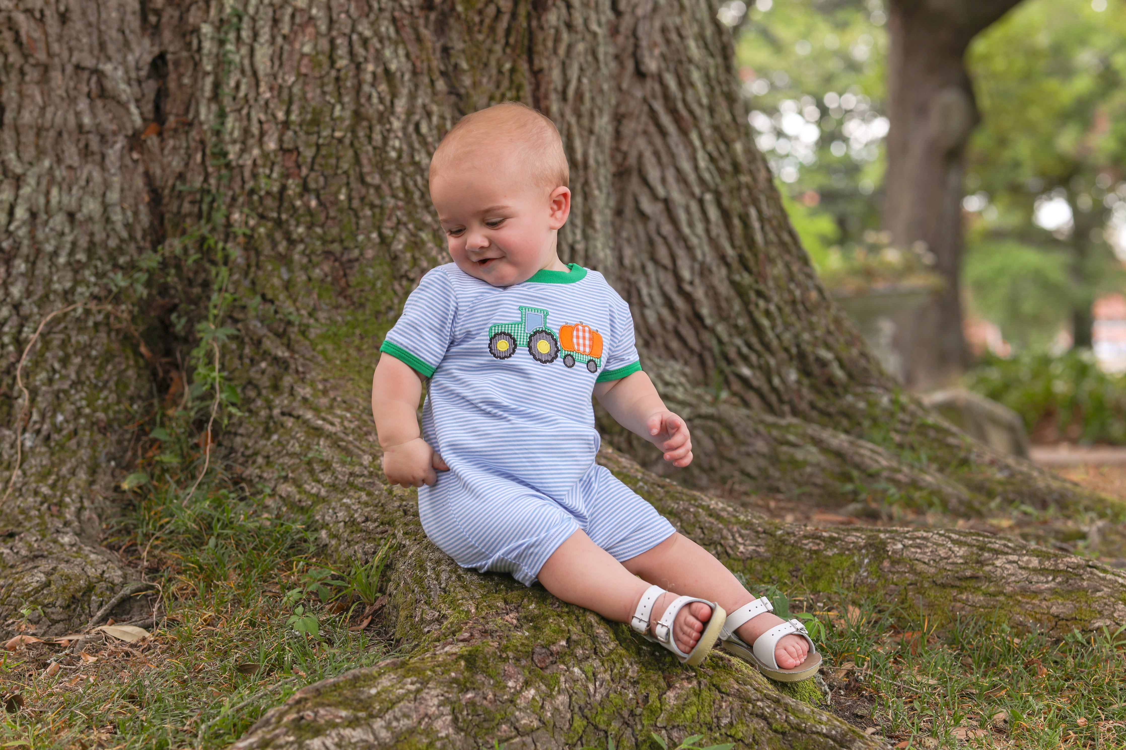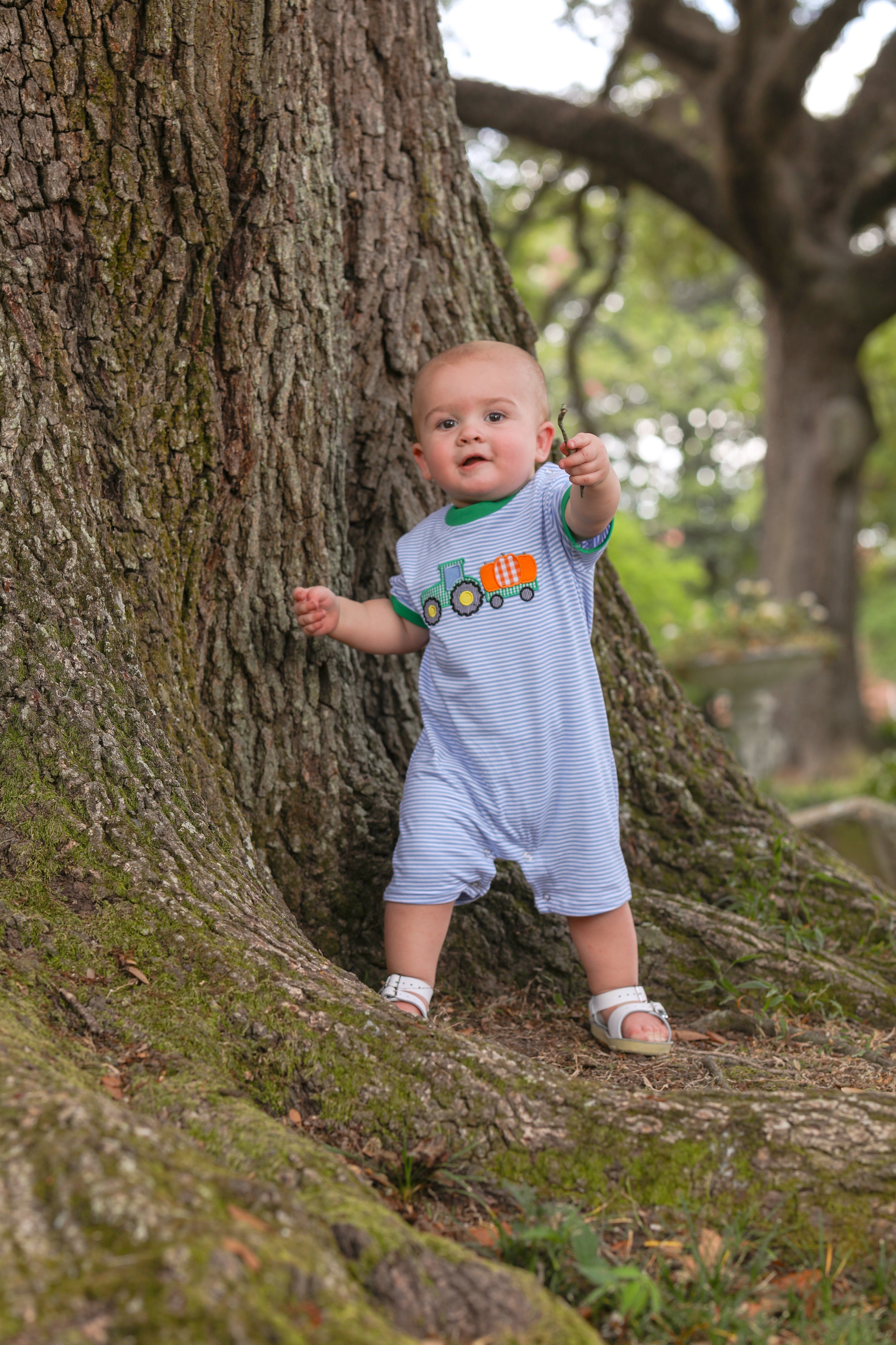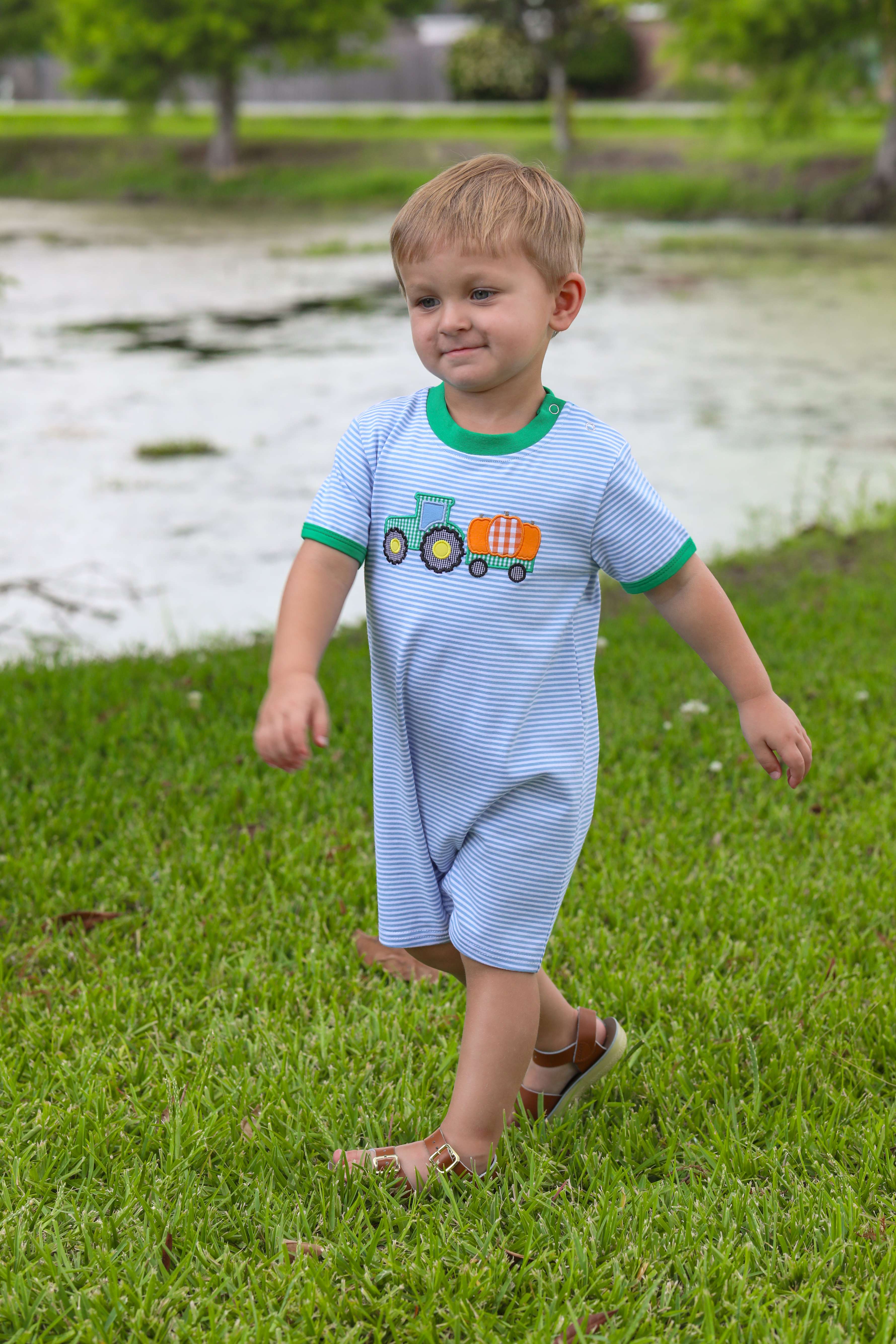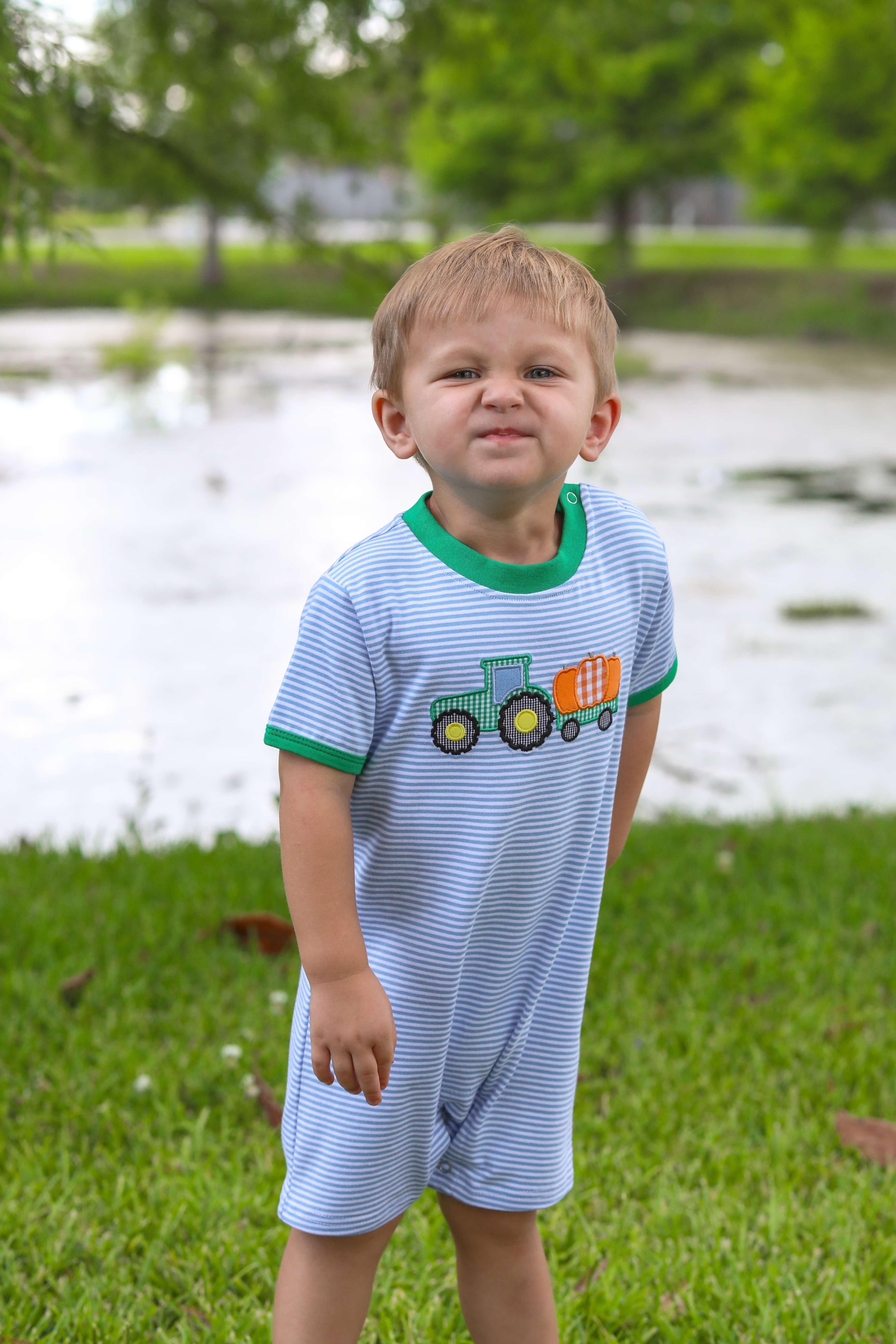 Autumn leaves & pumpkins, please! The knit Farm Tractor Pumpkin Applique Romper is one of the top picks this season. Perfect for fall fun for your little man! Matching sibling options available. 95% Cotton 5% Spandex.