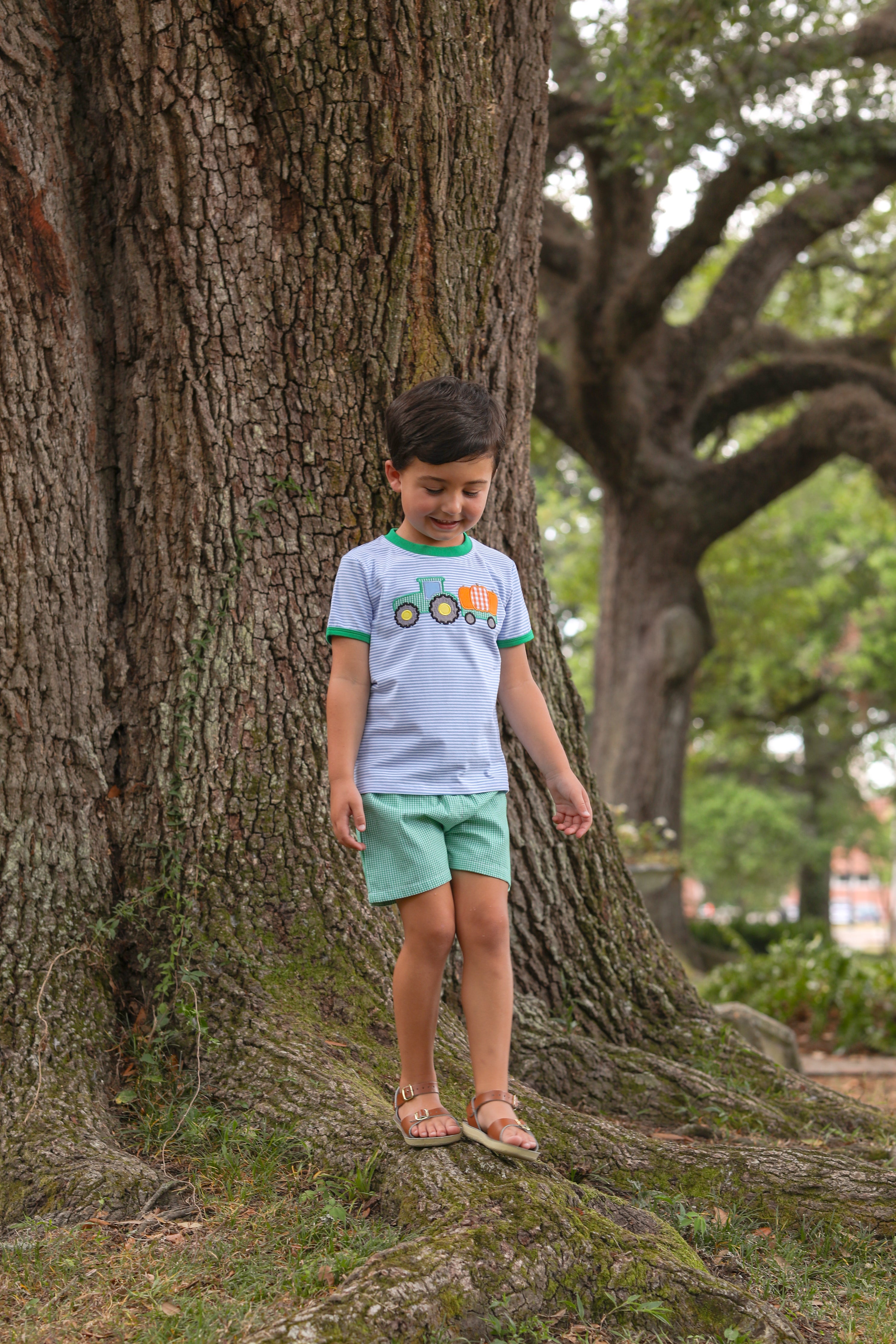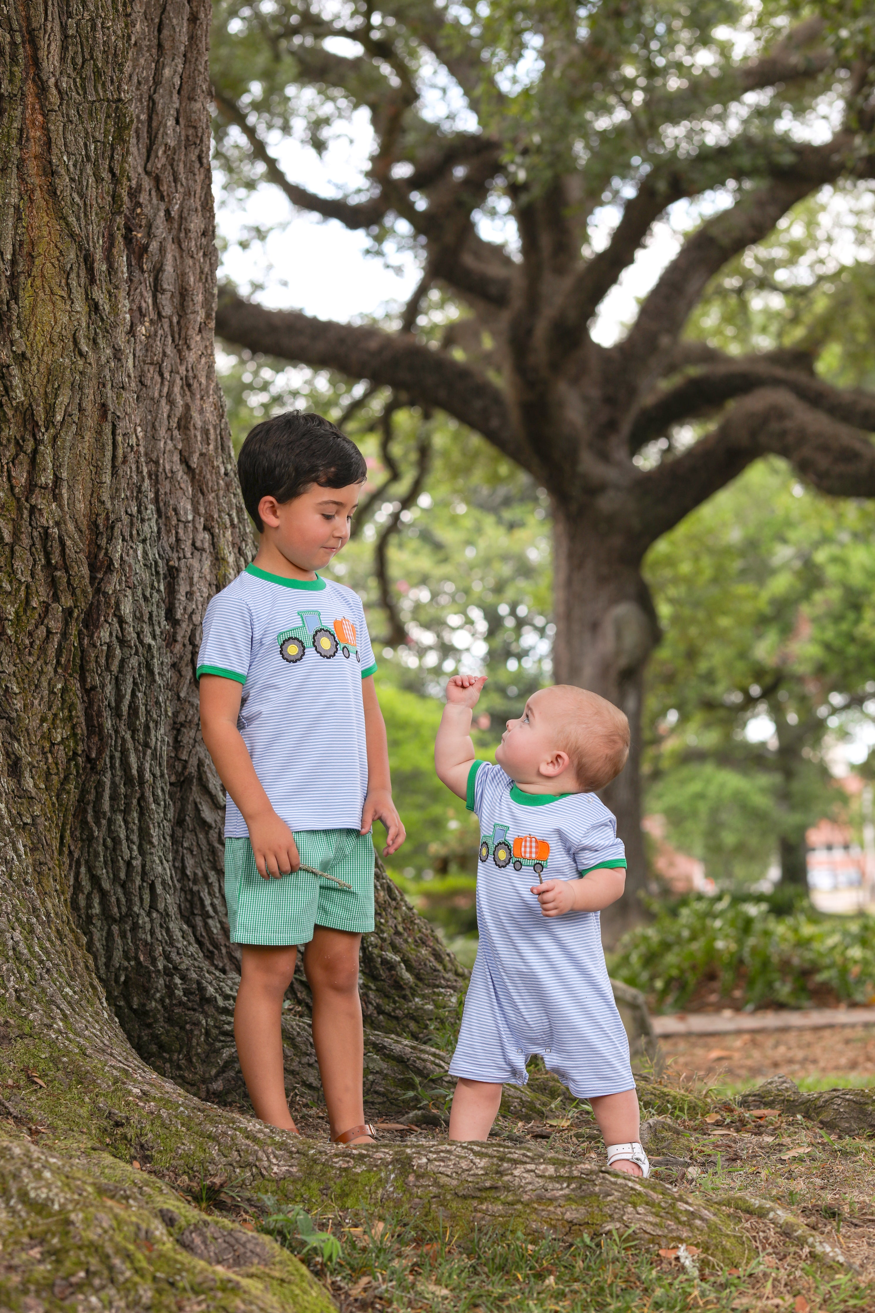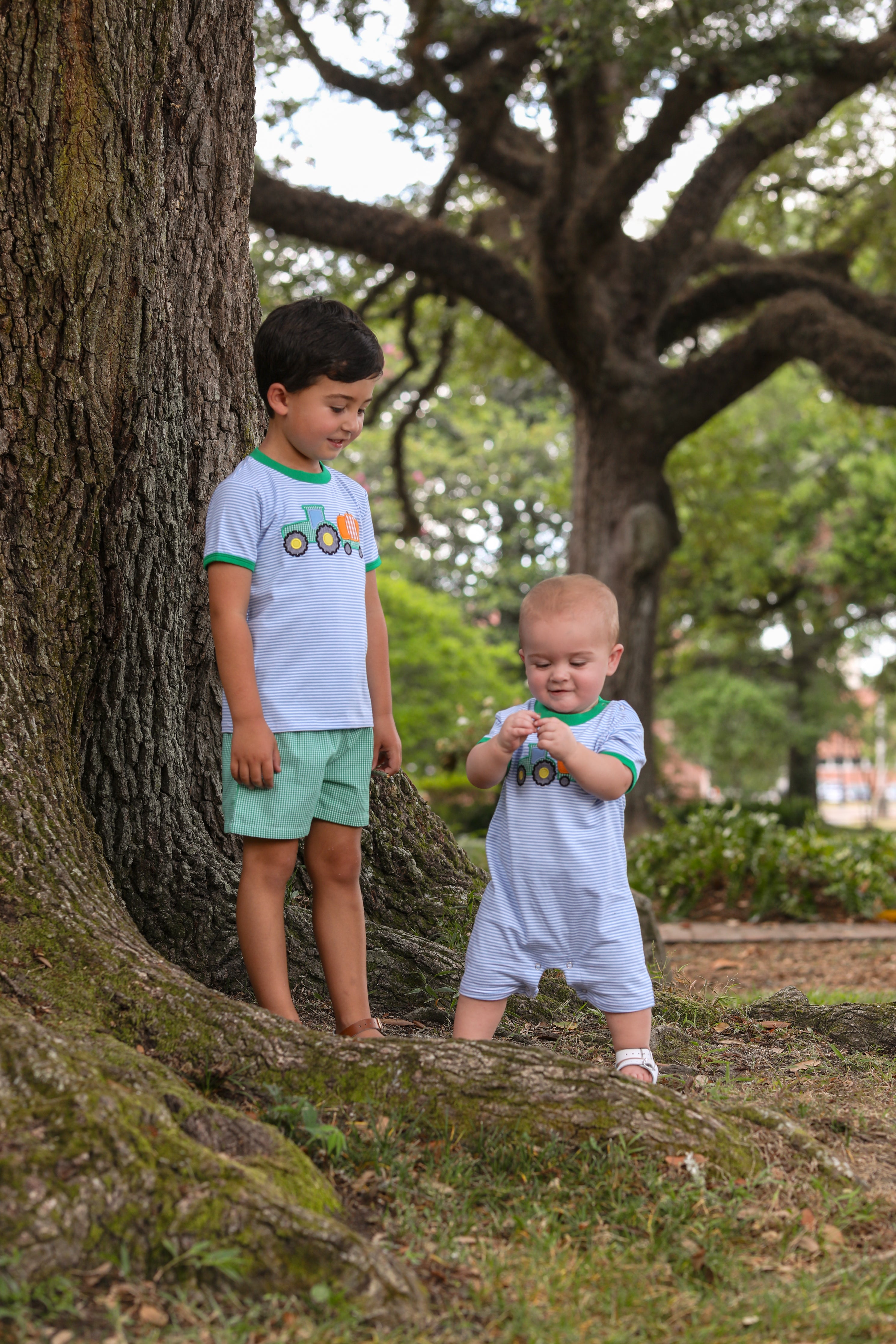 Autumn leaves & pumpkins, please! The knit Farm Tractor Pumpkin Applique Short Set is one of the top picks this season. Perfect for fall fun for your little man! Matching sibling options available. 95% Cotton 5% Spandex.
