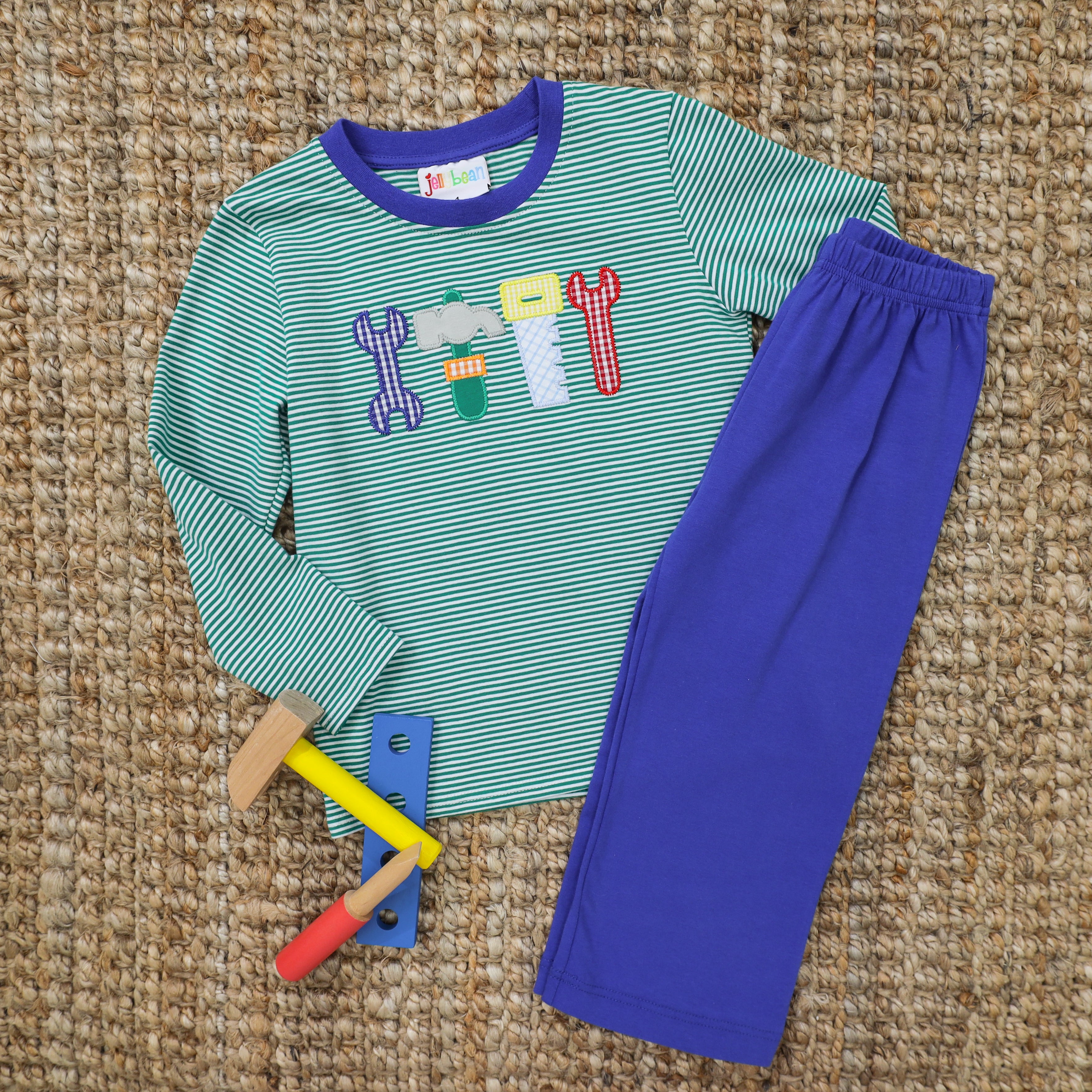 Get your little one ready to tackle any project with our Tool Shirt! Made from 95% cotton and 5% spandex, this shirt is both comfortable and durable. The green and white striped design adds a playful touch, while the 4 tool appliques add a touch of creativity. Complete the look with our matching younger brother Tool Romper. Perfect for your handyman!