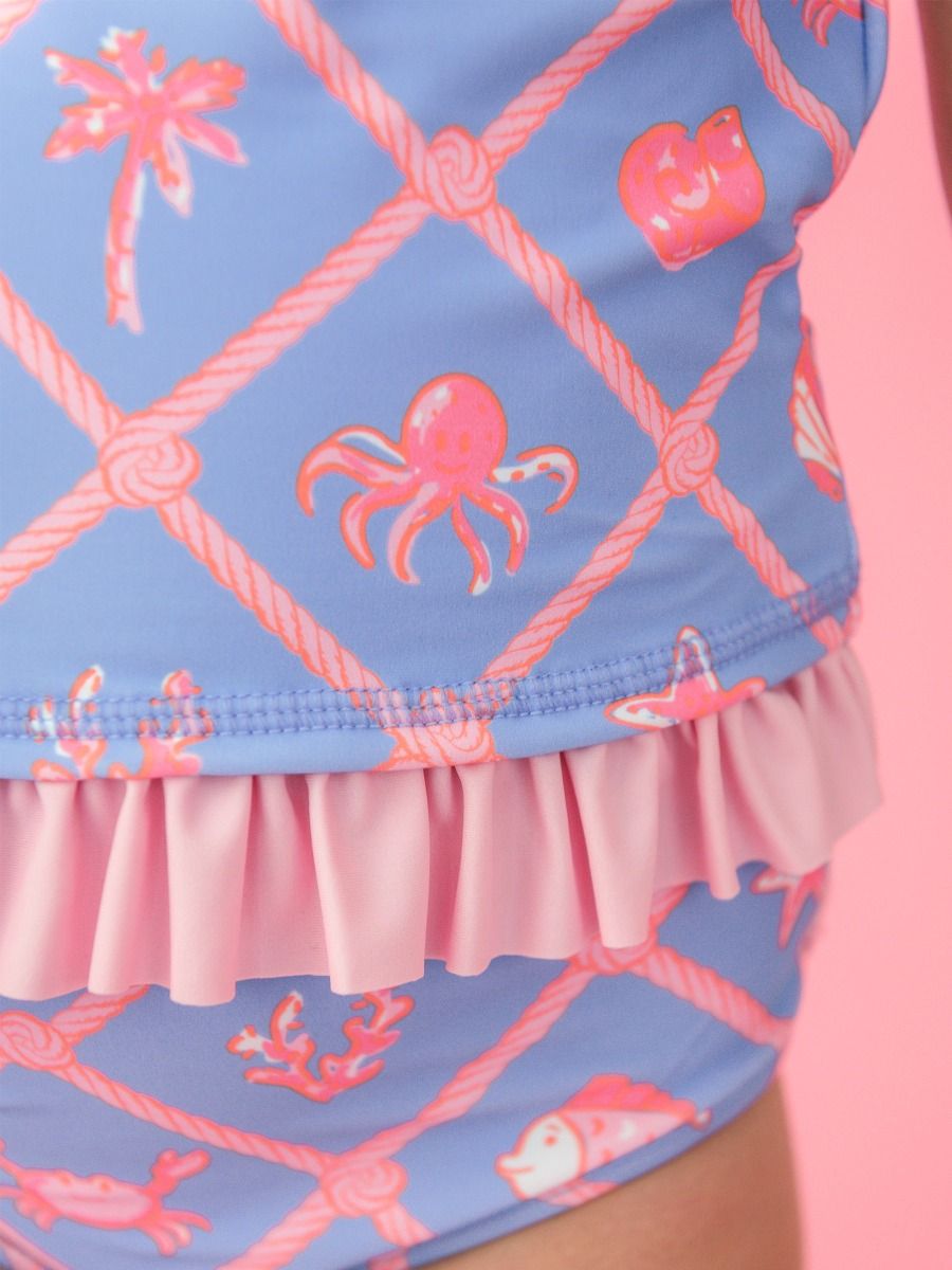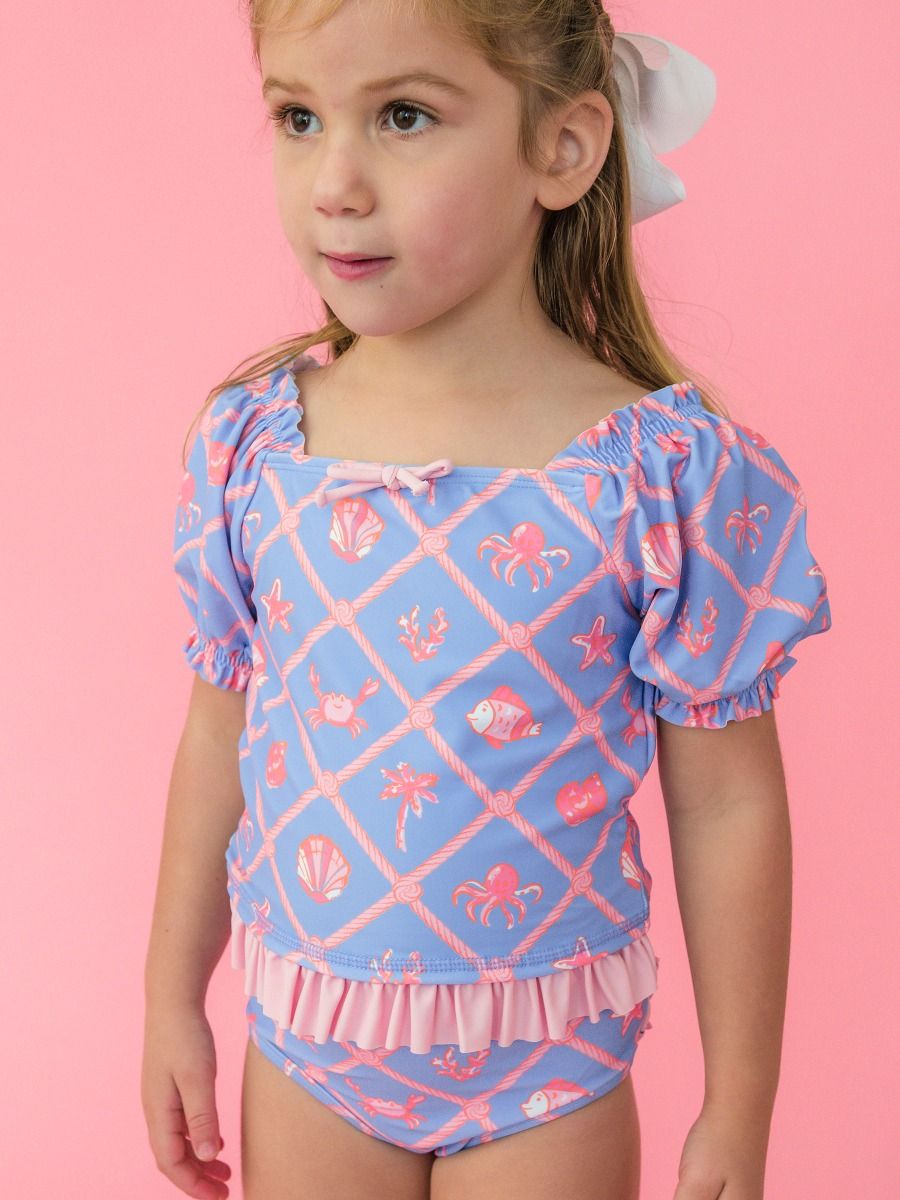Puff Sleeve Ruffle Tankini 2-Piece Swimsuit- Tropical Trellis