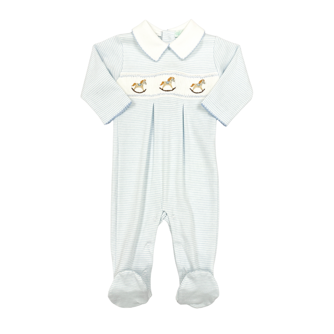 Baby boy's blue rocking horse footie. made in fine, soft pima cotton for the comfort of your baby