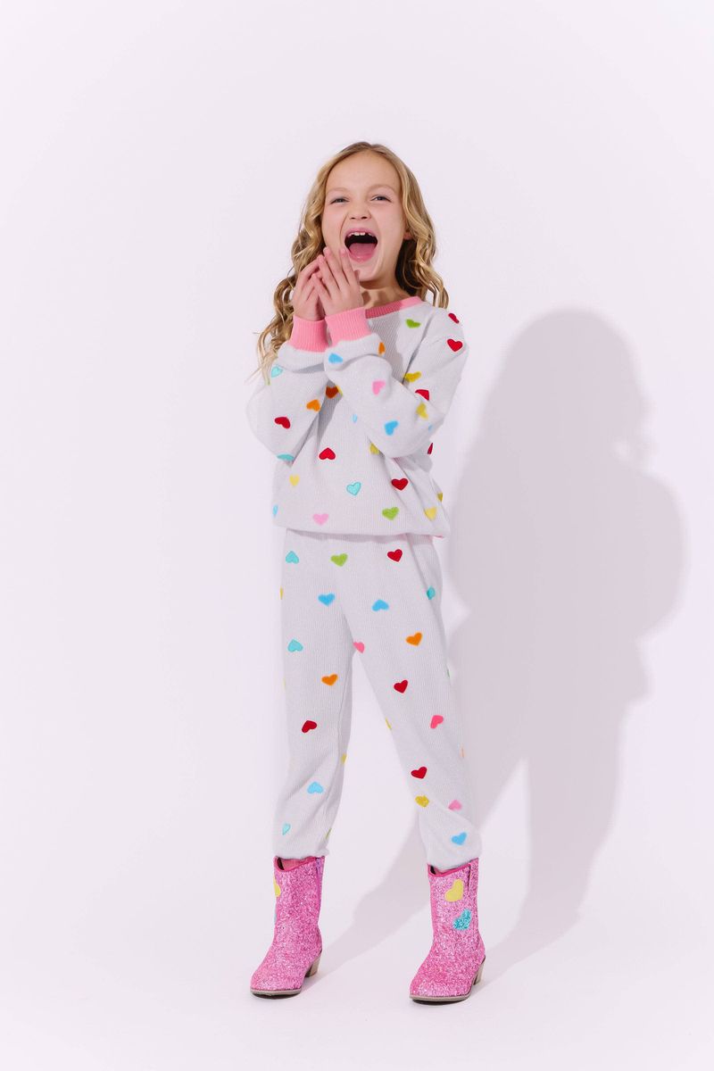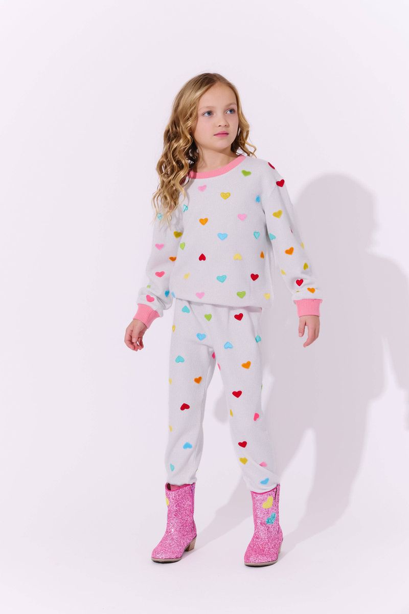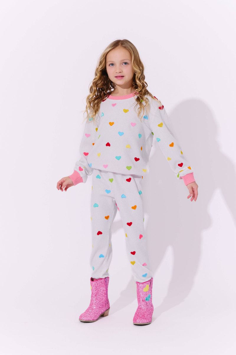 - Features a white ribbed knit fabric adorned with colorful embroidered hearts in rainbow shades.