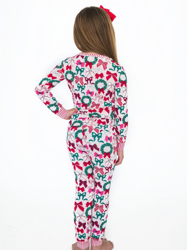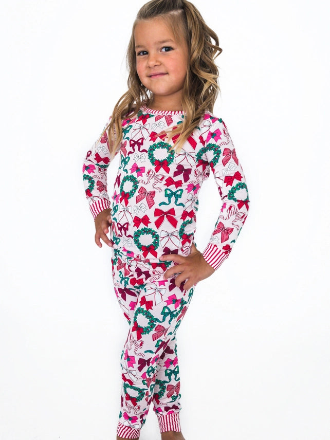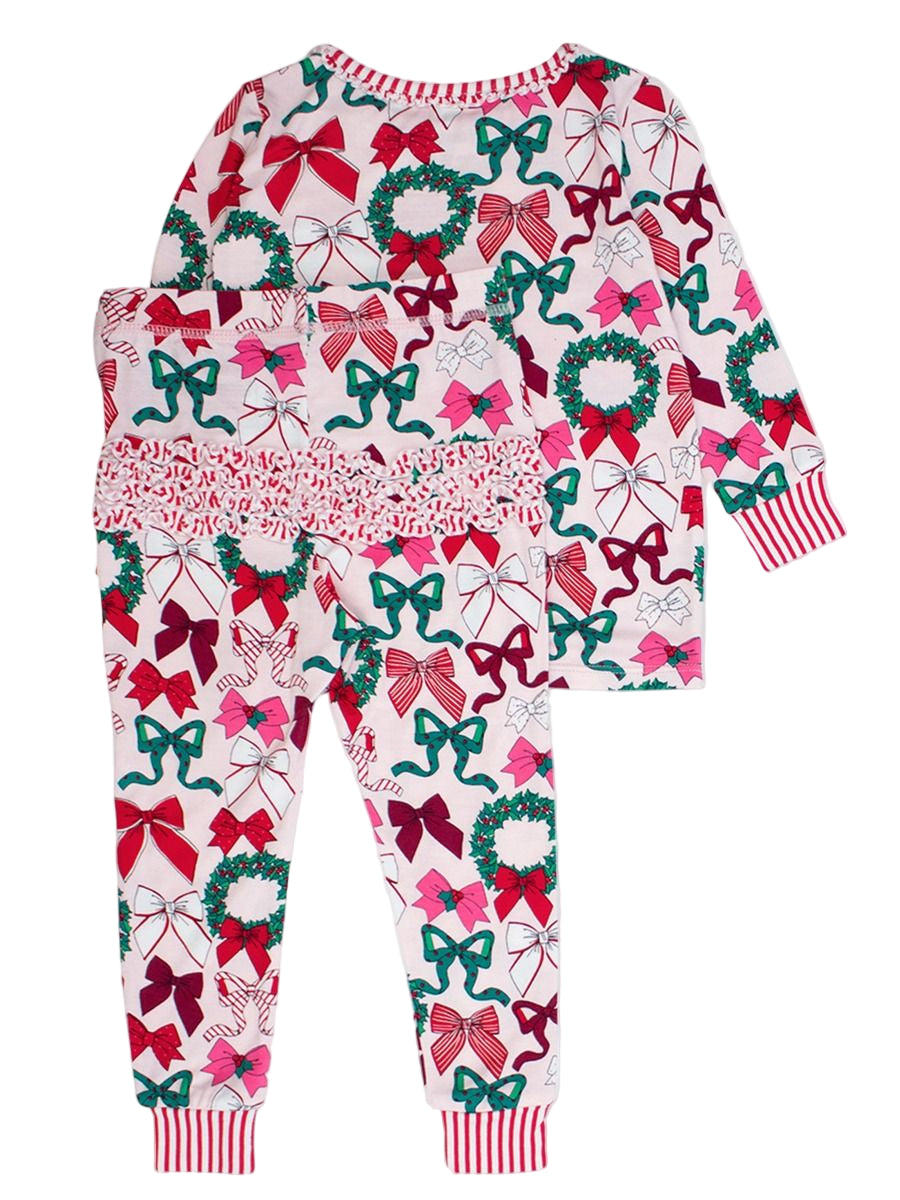 Ruffle Butts & Rugged Butts- Softsnoozeâ„¢ Toddler Girls Bamboo Viscose Holly Bows Ruffle Long Sleeve Pajama Set with Signature Rear Ruffles