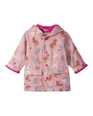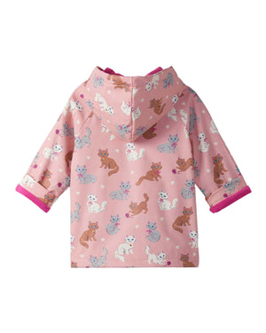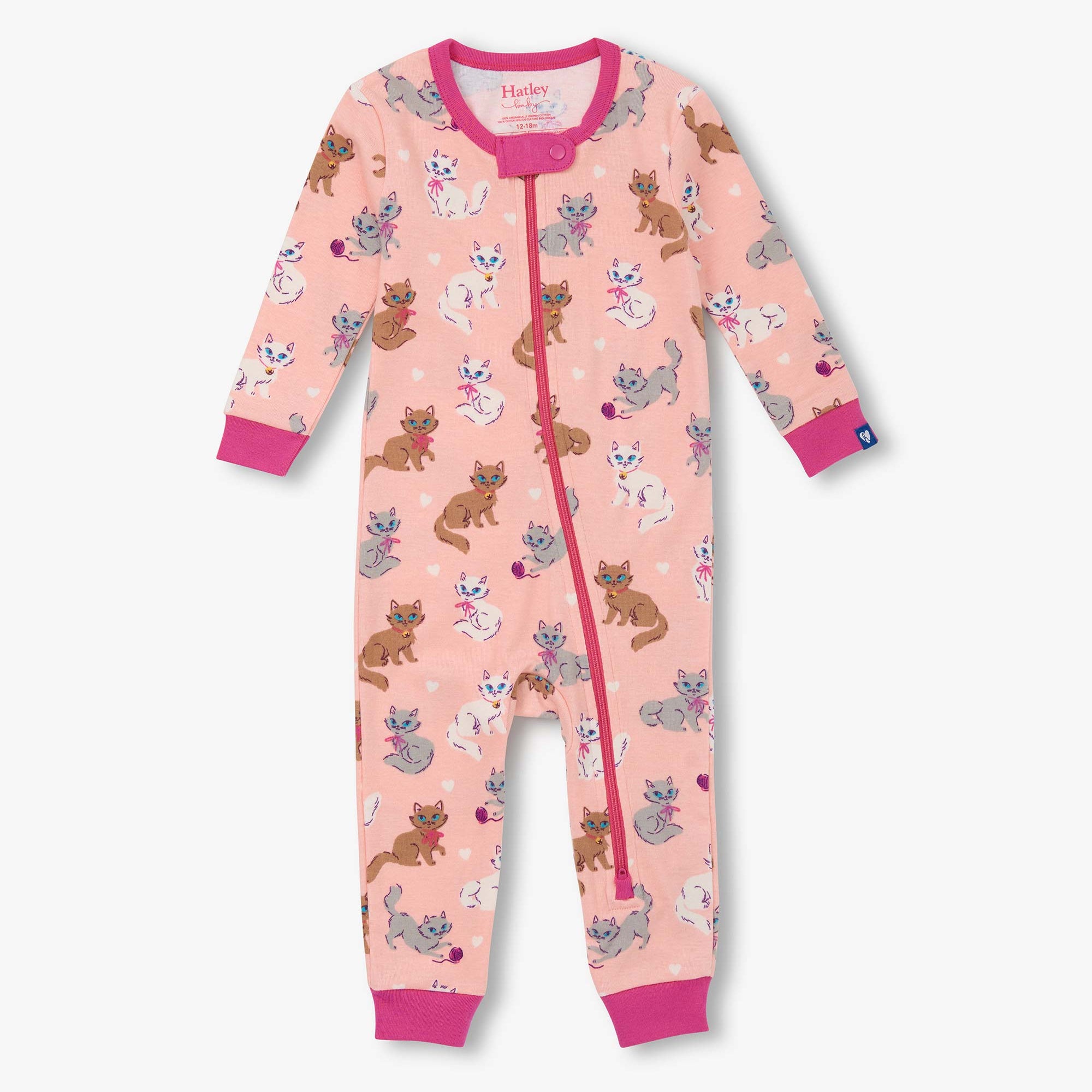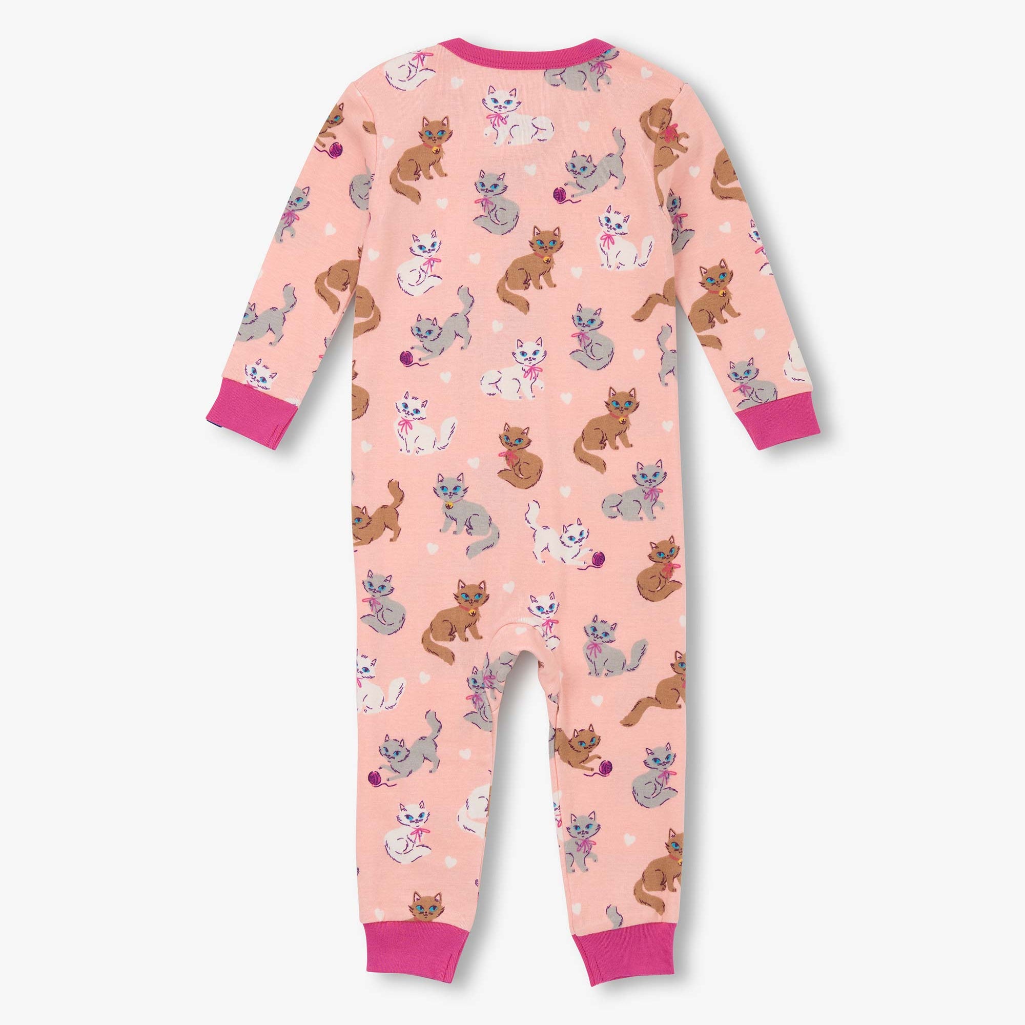 The Baby Girls Little Kitties Cotton Sleeper in Pink is made from 100% soft cotton for ultimate comfort and breathability. Featuring an adorable all-over pattern of white, grey, and brown kittens with dark pink bows and collars, this footless sleeper has a tight fit that’s perfect for sleep and play. The light pink background is complemented by a dark pink neck, elastic cuffed wrists and ankles, and a convenient front zipper from ankle to neck with a snap at the top for easy changing.