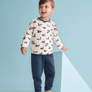 The Boys Duck Decoys Cotton Pajama Set in Cream pairs cozy comfort with playful outdoorsy charm, crafted from 100% breathable cotton for restful nights. This classic two-piece set includes a fitted long-sleeve top and full-length bottoms, both featuring forest green accents at the neck, wrists, and ankles. A cream background sets the stage for an all-over print of colorful duck decoys that capture the spirit of adventure. With an elastic waistband for a flexible fit, it’s a bedtime essential that keeps him comfy and tucked in with style.