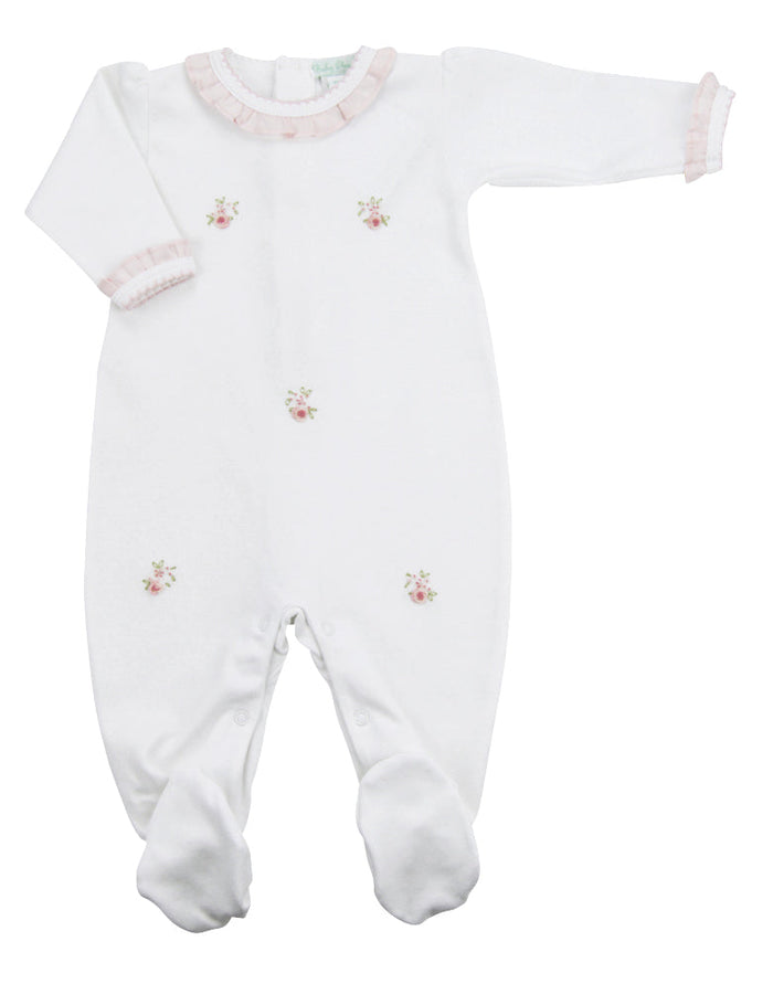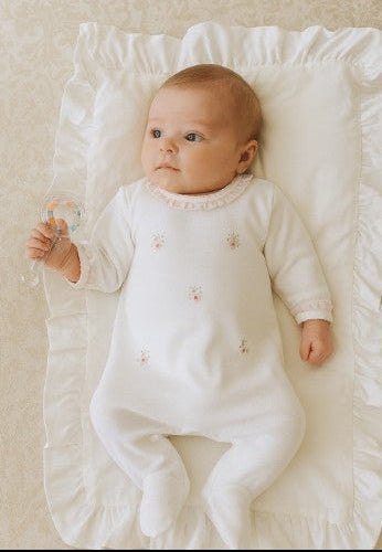 Baby girl's rose bouquets footie with pink trimming. the embroidered flowers embroidered all over are made 3D, a very intricated technique, a beautiful heirloom piece.