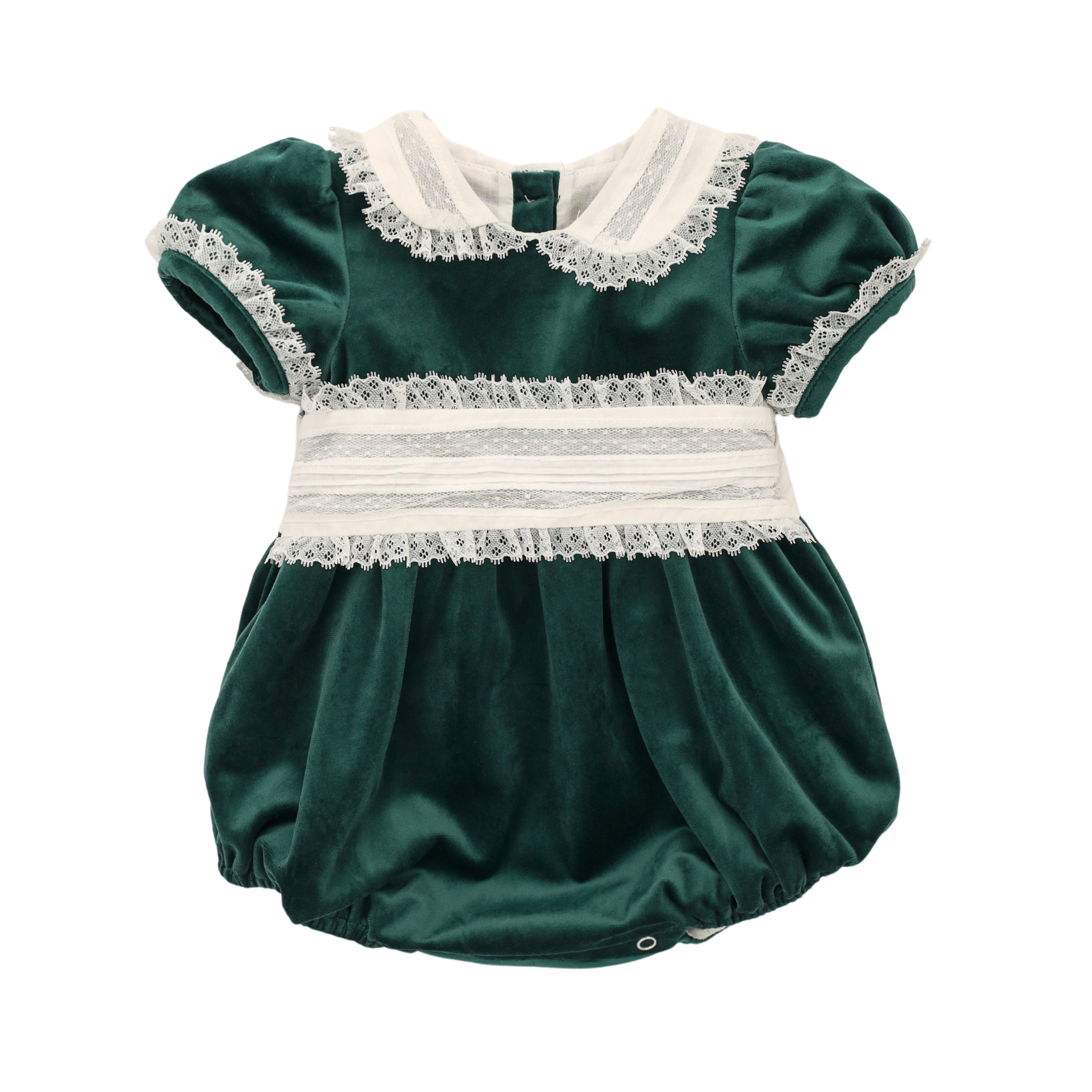 Get ready for ultimate comfort and style with the White & Green Velvet Bubble featuring a dainty lace sash. The plush velvet material will keep your little one cozy, while the lace adds a hint of elegance. Perfect for any special occasion or holiday! Matching sibling outfits available!